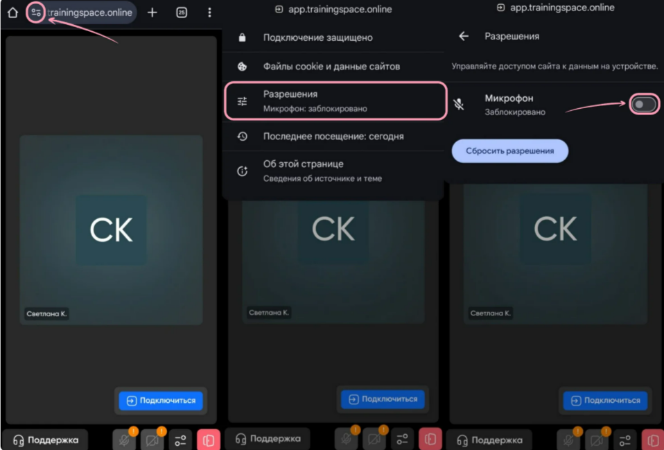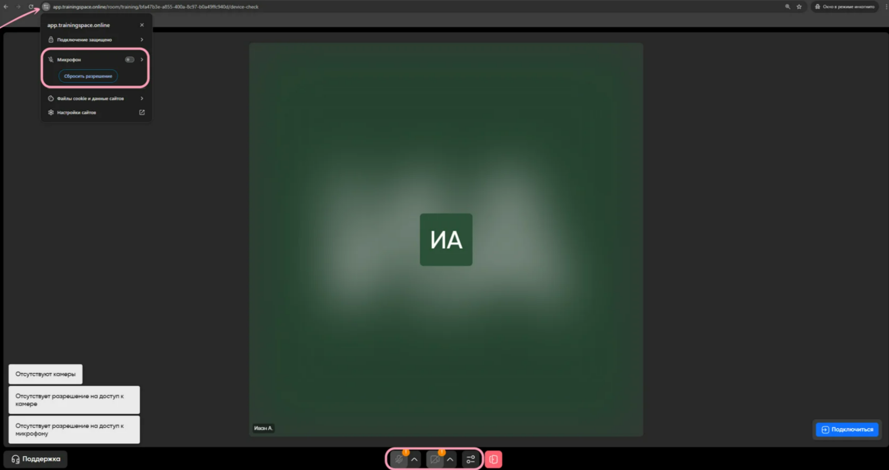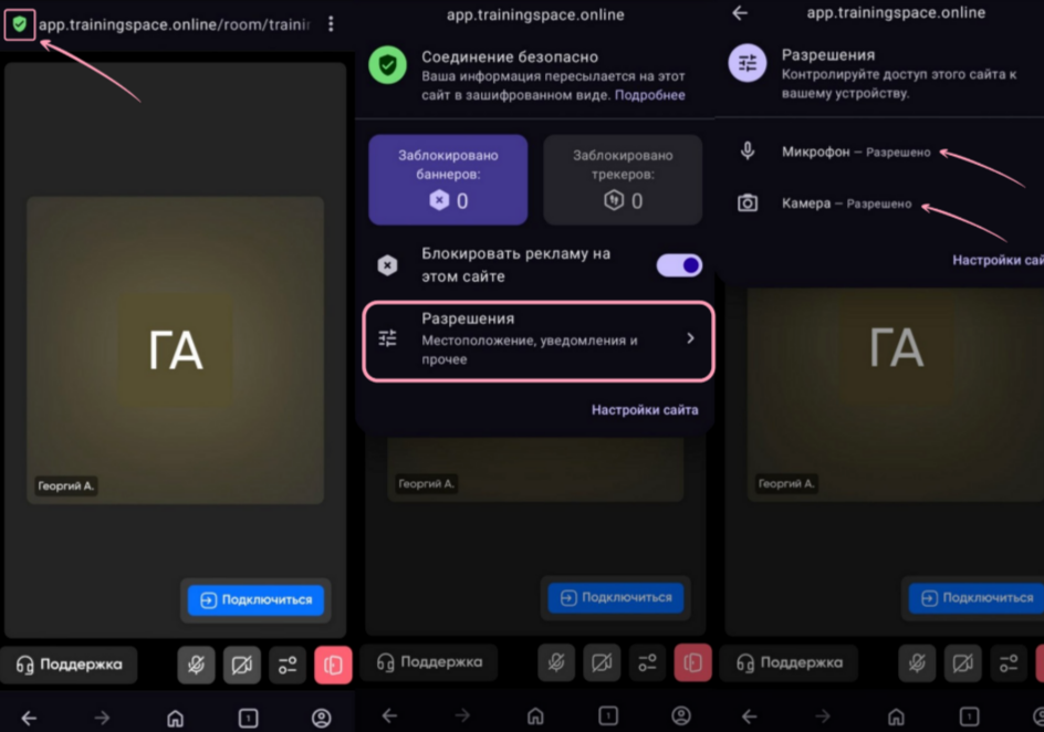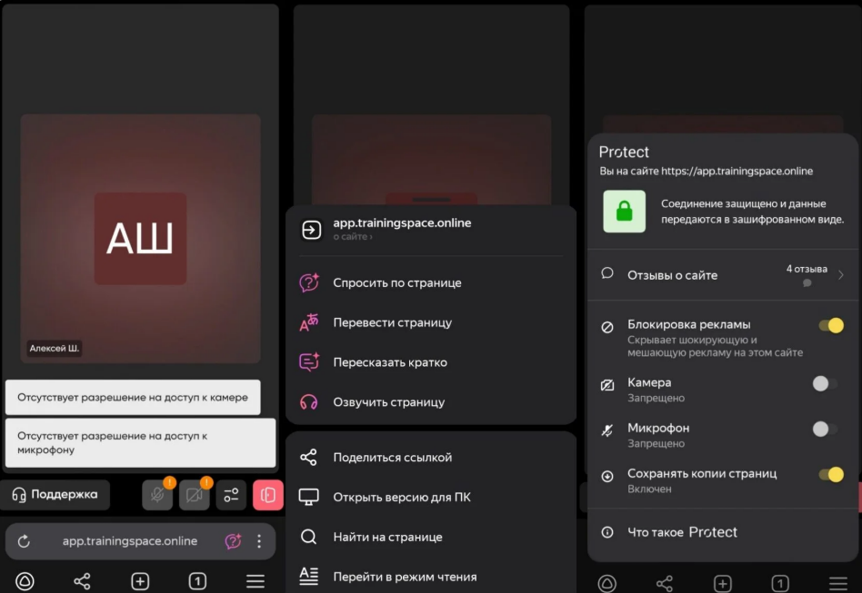 Нажмите на три точки рядом с адресной строкой. В открывшемся меню нажмите на «app.trainingspace.online» или «О сайте». Найдите пункты «Камера» и «Микрофон» и установите для них значение «Разрешить». После этого перезагрузите страничку, чтобы изменения вступили в силу.