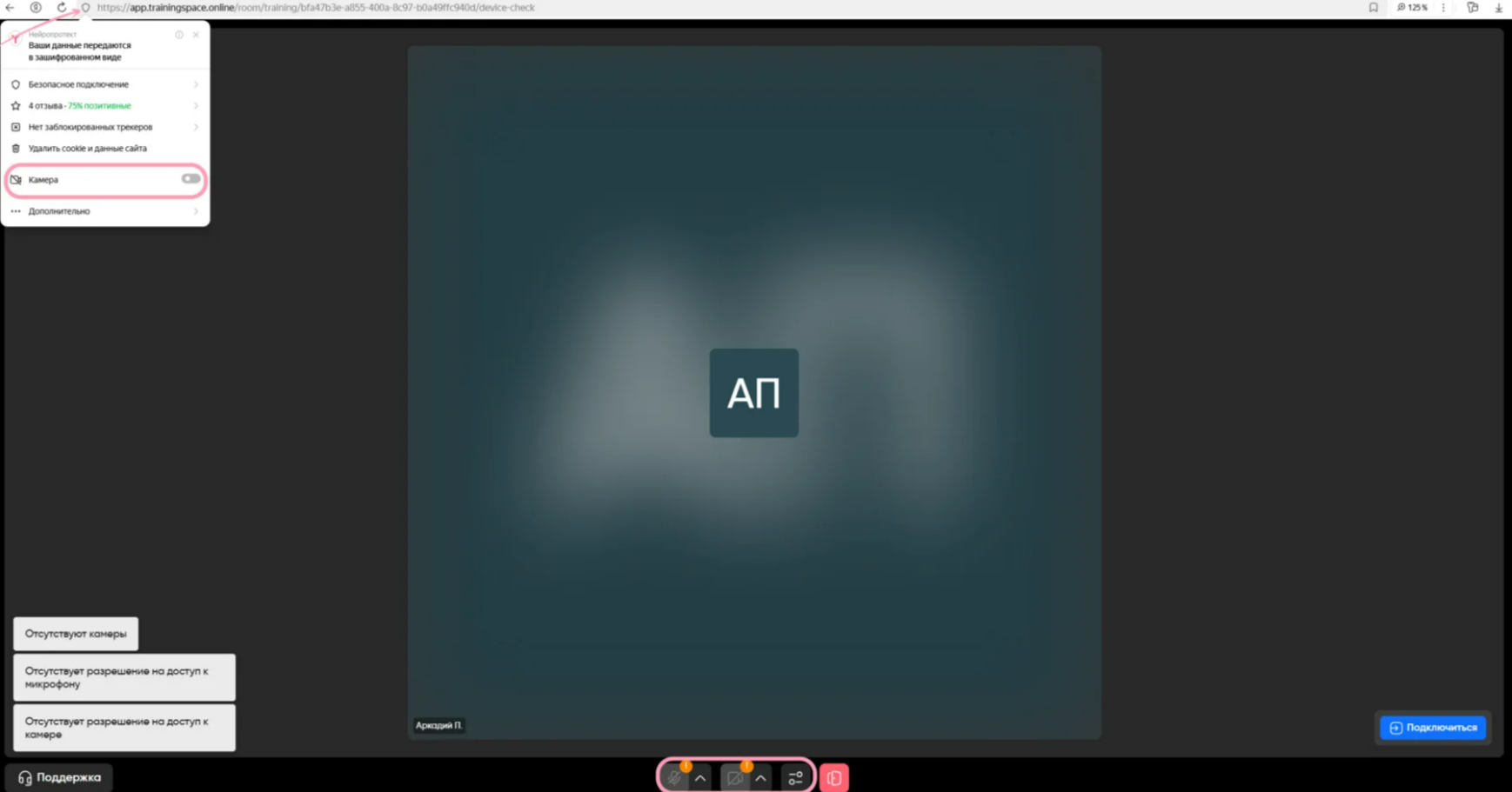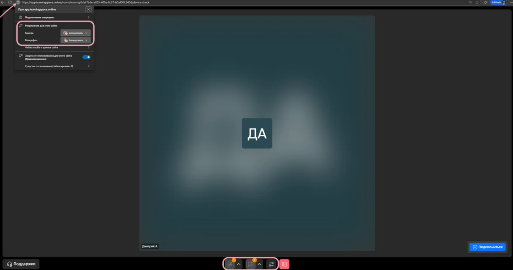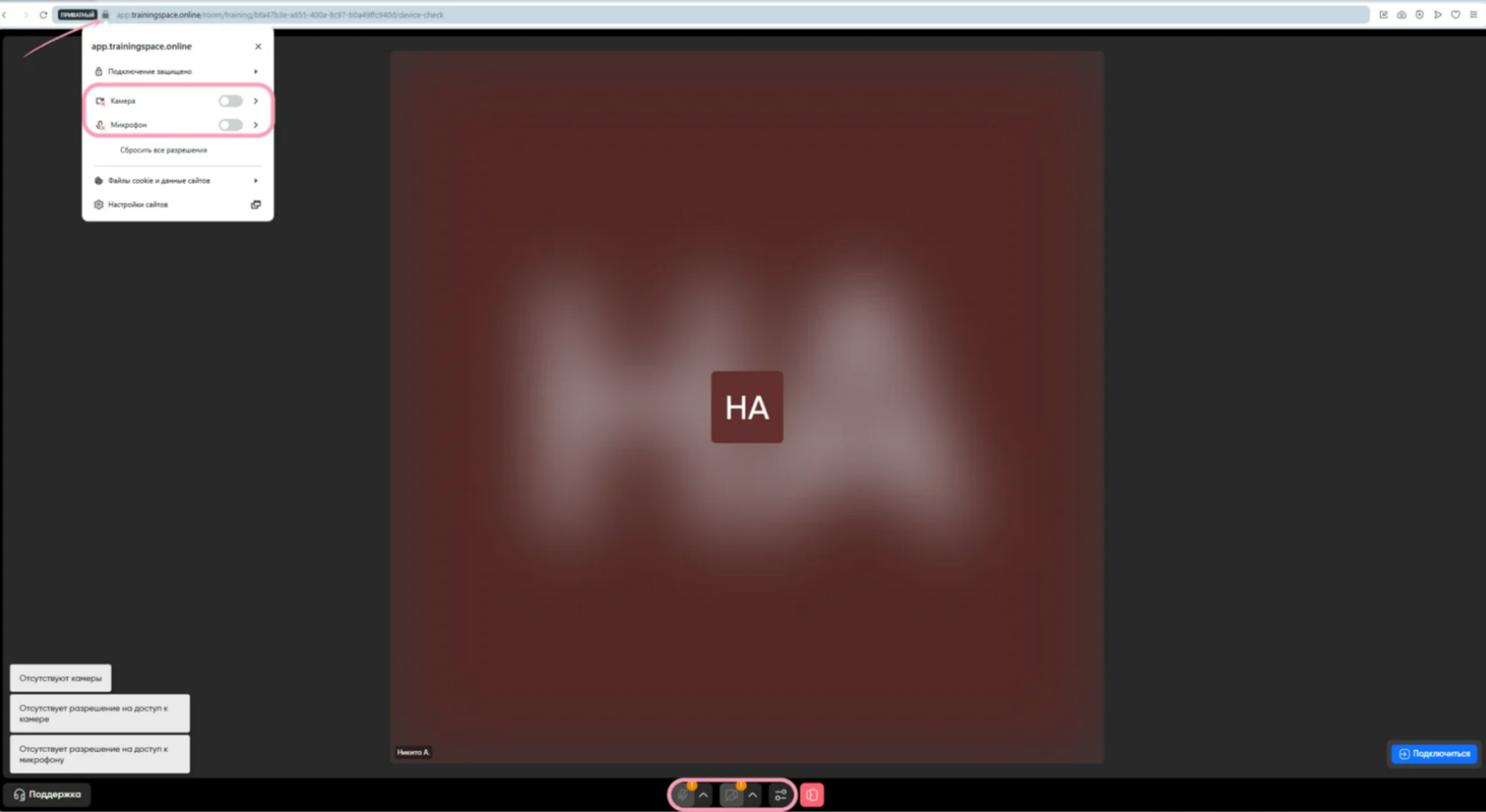 Нажмите на три точки рядом с адресной строкой. В открывшемся меню нажмите на «app.trainingspace.online» или «О сайте». Найдите пункты «Камера» и «Микрофон» и установите для них значение «Разрешить». После этого перезагрузите страничку, чтобы изменения вступили в силу.