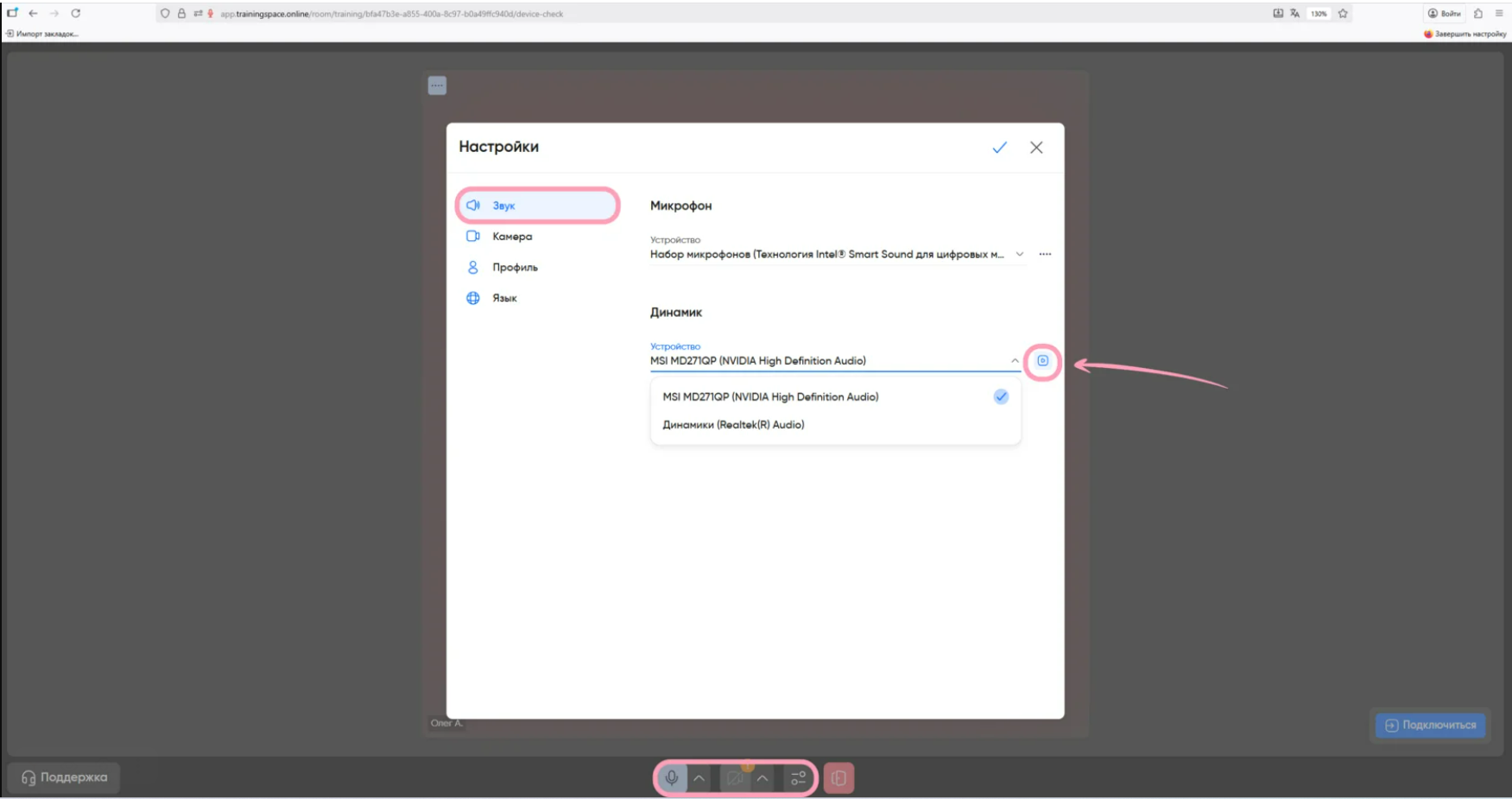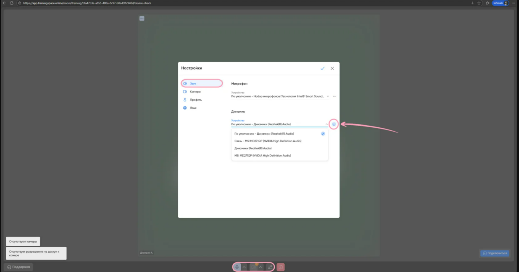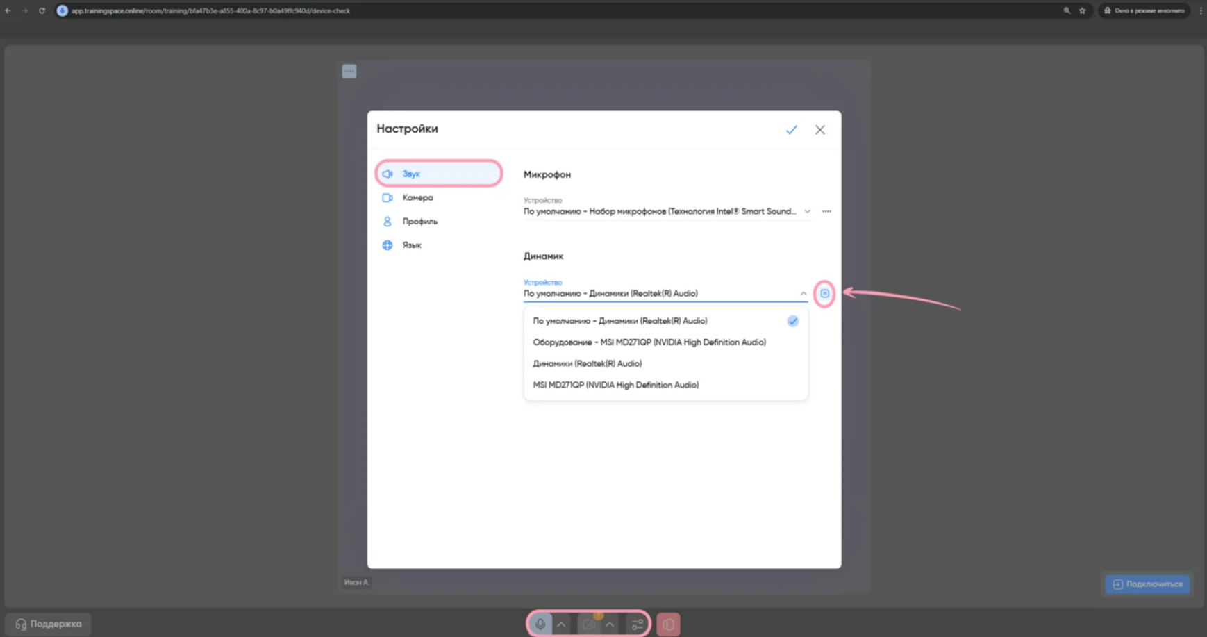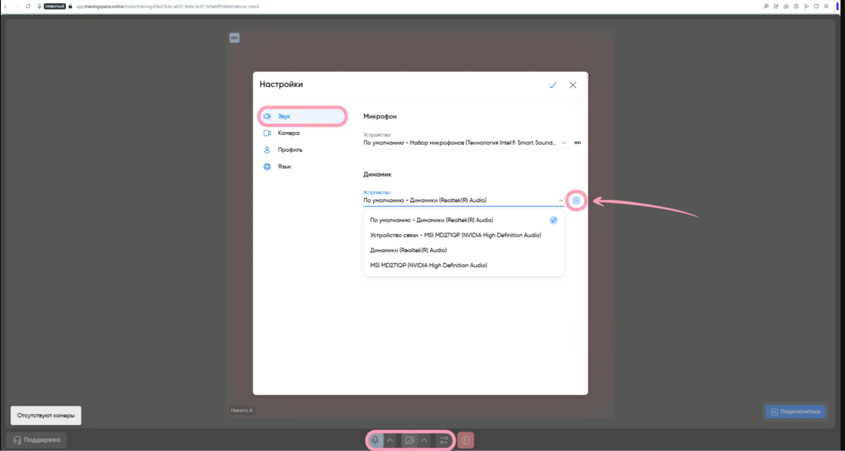 Для изменения источника звука, микрофона или камеры найдите настройки внизу странички и выберите нужное устройство. Также вы можете проверить работоспособность динамиков в разделе настроек. Для этого перейдите в «Звук», затем рядом со строкой «Динамик» нажмите на иконку воспроизведения, чтобы динамики проиграли звук. Если все настроено, нажмите «Подключиться» — вы попадёте в комнату с мероприятием.