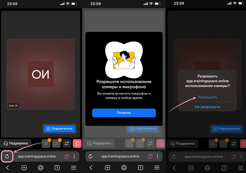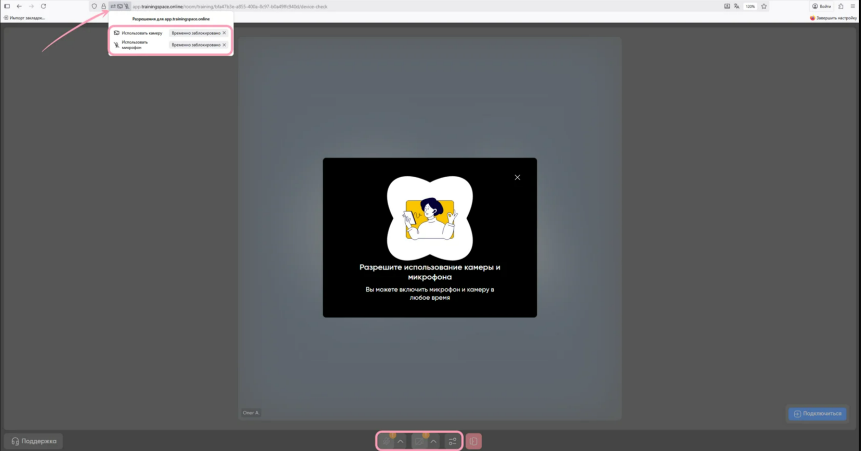 Перезагрузите страничку, чтобы разрешить использование камеры и микрофона. После перезагрузки нажмите «Понятно» во всплывающем уведомлении, затем последовательно разрешите доступ к камере и микрофону, выбирая «Разрешить» в появившихся окнах. После нажмите «Подключиться», чтобы попасть в комнату с участниками.