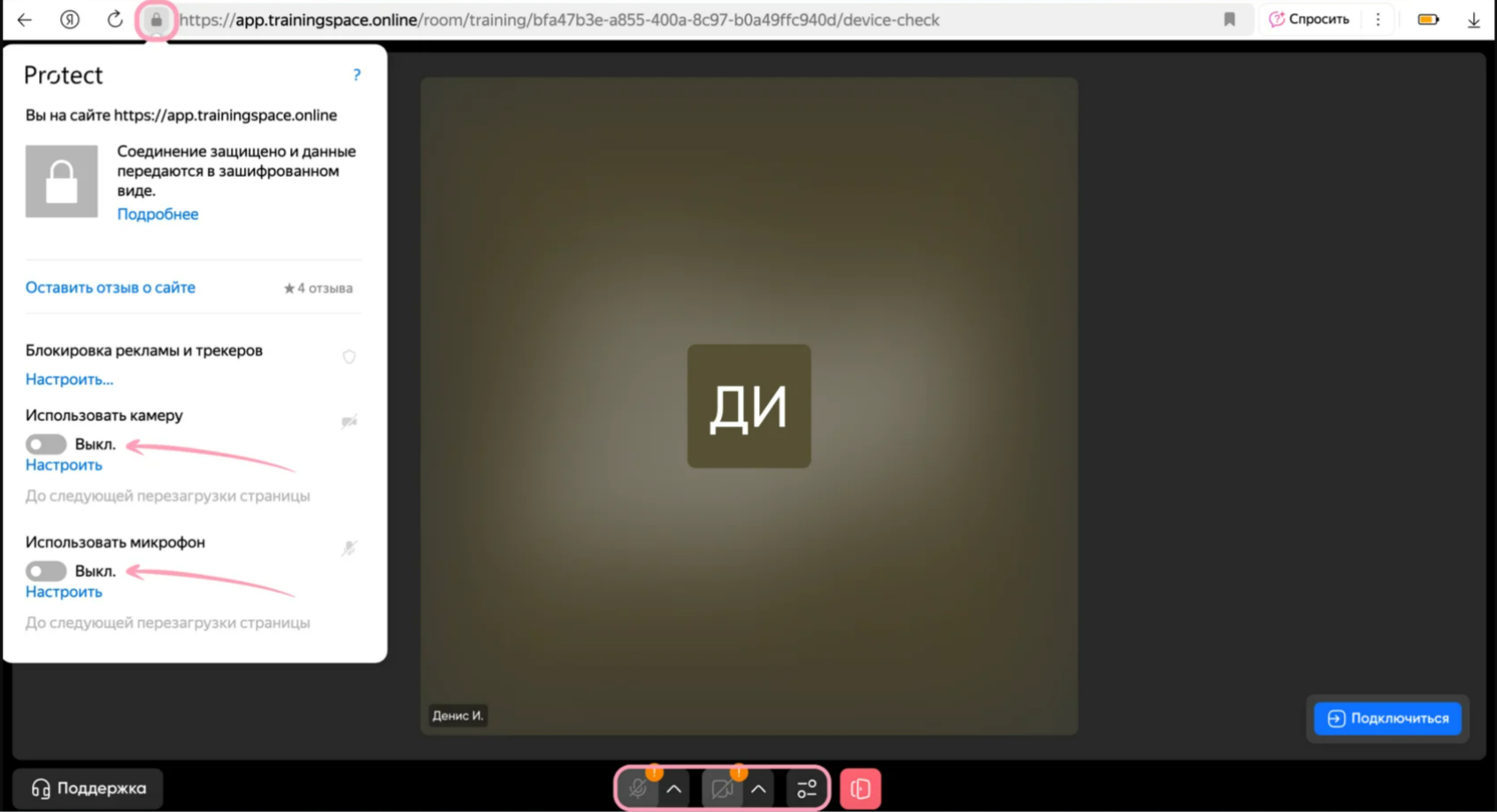 Нажмите на значок замка слева от адреса сайта. В открывшемся окне найдите пункты «Использовать камеру» и «Использовать микрофон». Переключите оба ползунка из положения «Выкл» в положение «Вкл». После этого обновите страничку, нажав на круглую стрелку в браузере. Для выбора другого устройства найдите настройки внизу экрана и выберите нужное устройство из списка. Для входа в комнату нажмите кнопку «Подключиться».