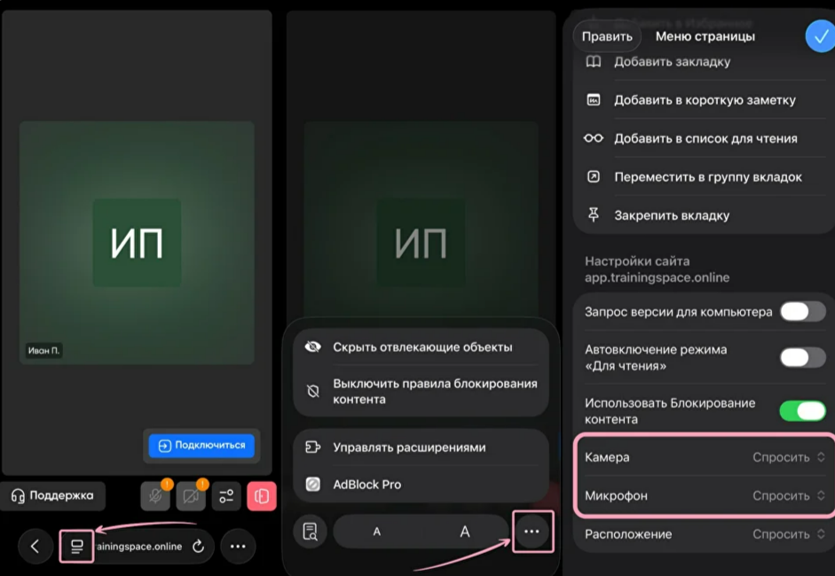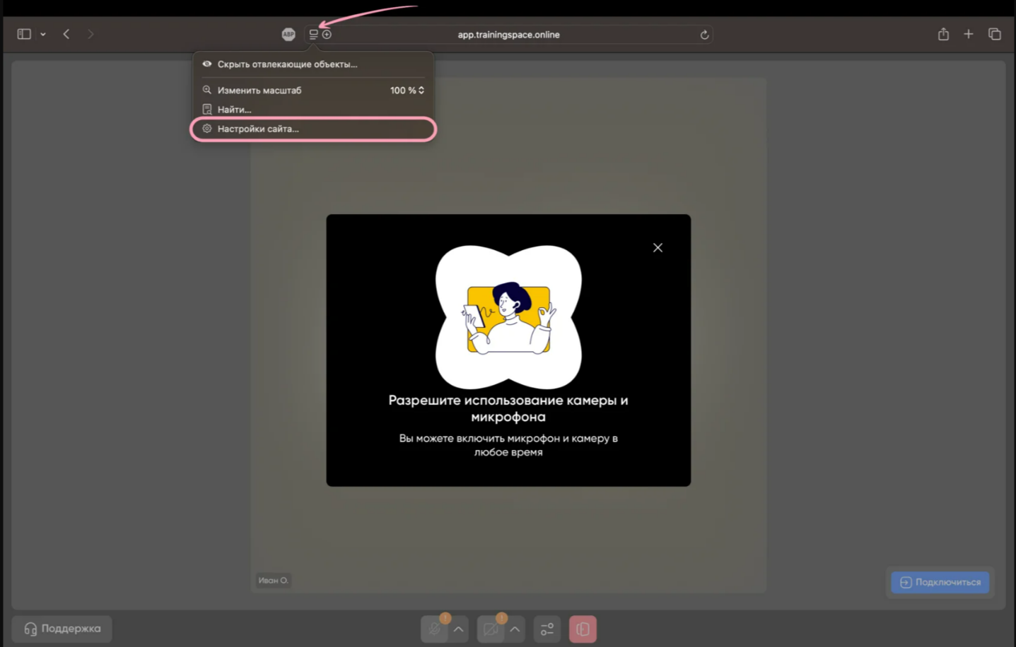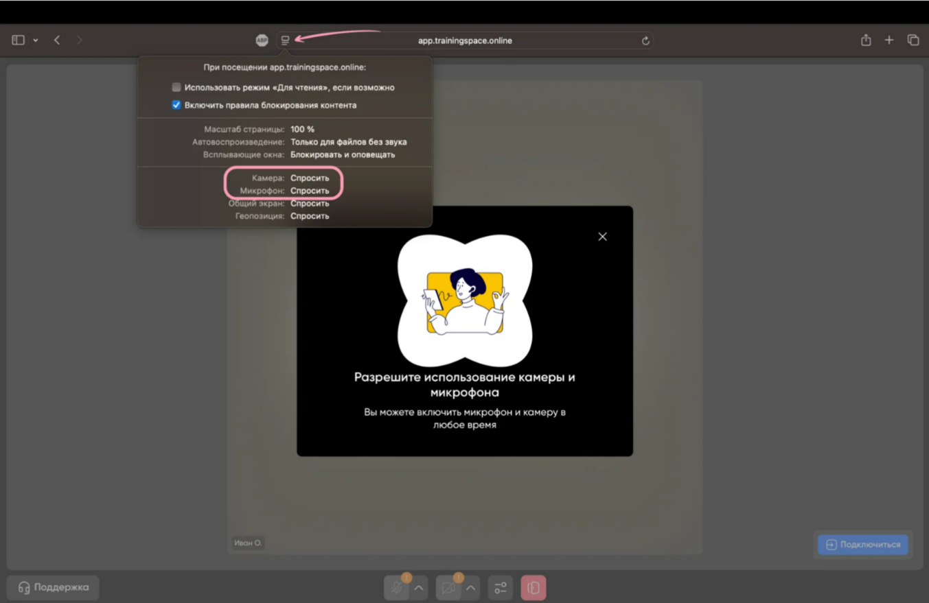 Чтобы дать разрешение камере и микрофону, слева от адресной строки app.trainingspace.online нажмите на кнопку «Настройки». Затем нажмите на три точки, опуститесь в самый низ раздела настроек и найдите пункты «Камера» и «Микрофон». Измените значение с «Спросить» на «Разрешить» для обоих устройств. Обновите страничку, чтобы изменения вступили в силу.