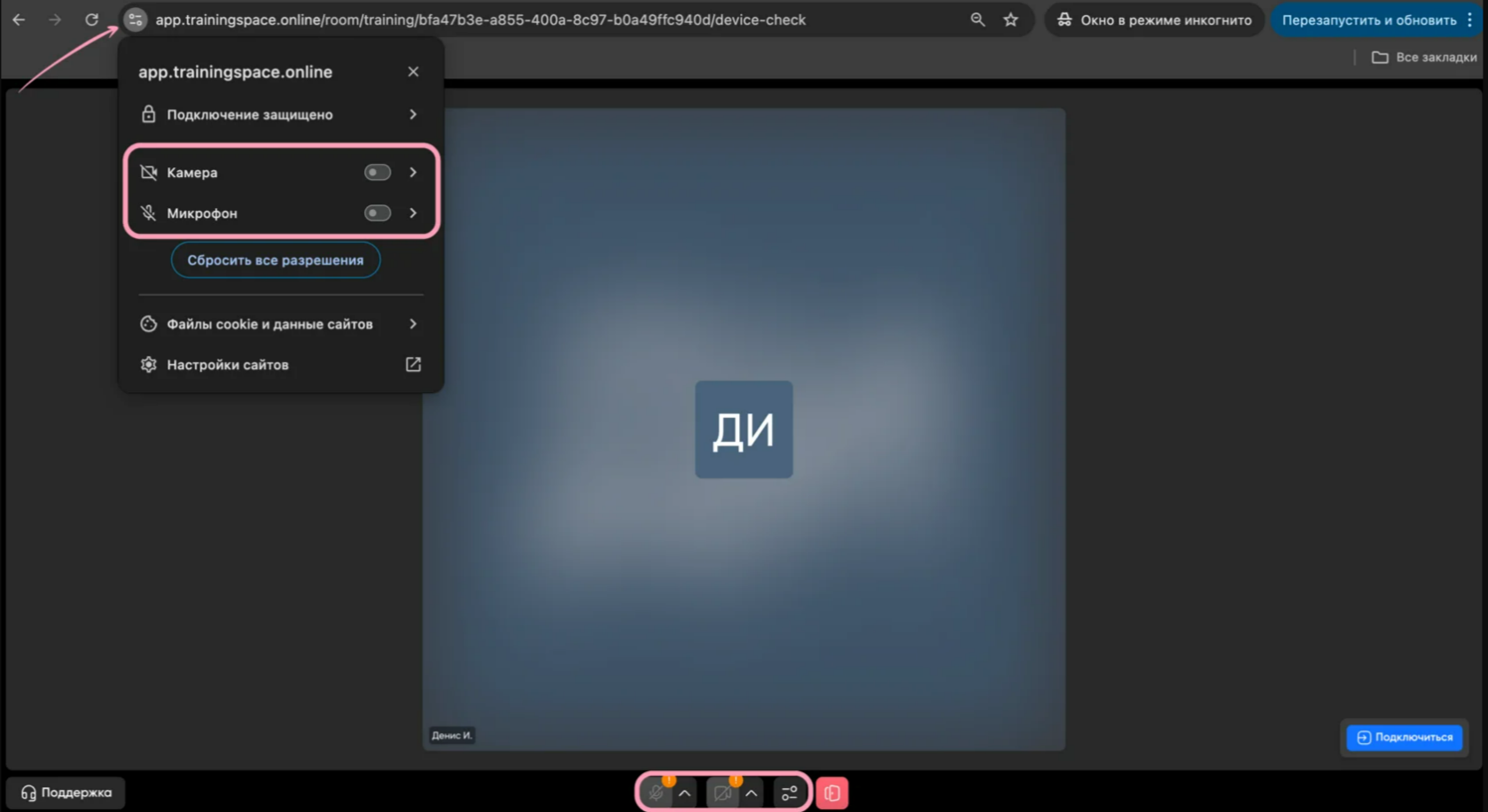 Слева от адресной строки нажмите «Настройки», выберите «Настройки сайта», внизу странички найдите пункты «Камера» и «Микрофон» и переведите их с «Спросить» на «Разрешить». Обновите страничку и нажмите «Подключиться» для входа в комнату.
