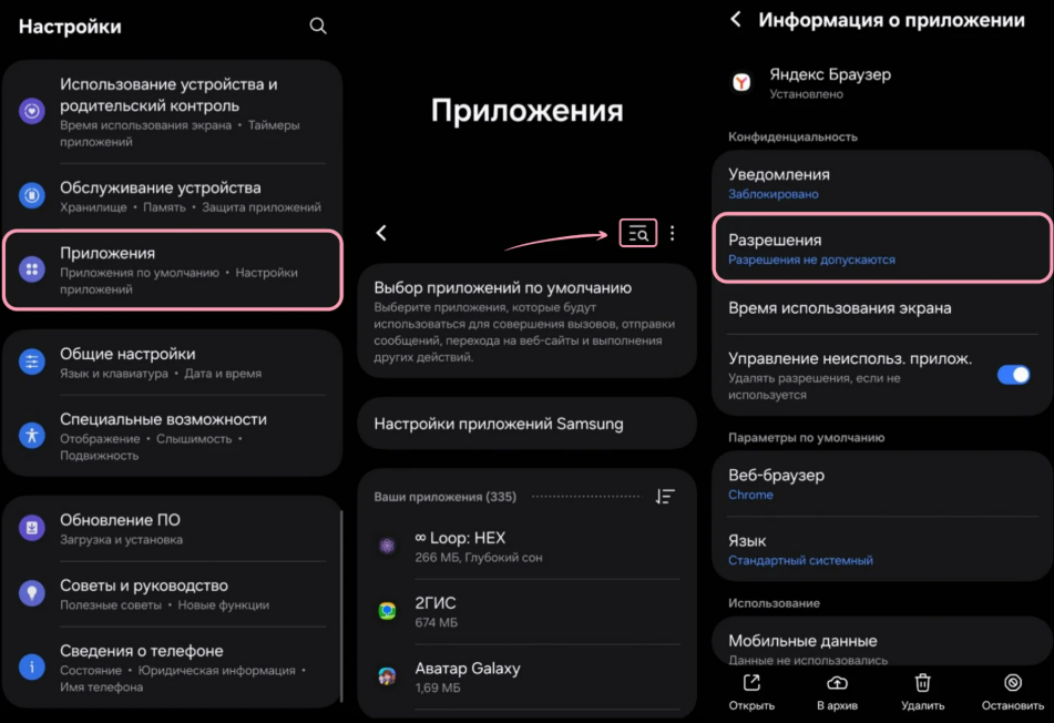 Если настройки в браузере не помогли, зайдите в настройки телефона, выберите «Приложения», найдите Яндекс Браузер и откройте «Разрешения». Разрешите доступ к микрофону и камере. После этого обновите страничку в браузере и проверьте работоспособность устройств.