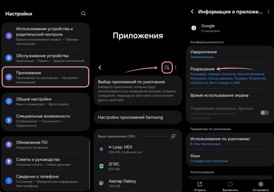 На примере Samsung S24 Ultra и iPhone 13 рассмотрим, где найти настройки включения камеры и микрофона.