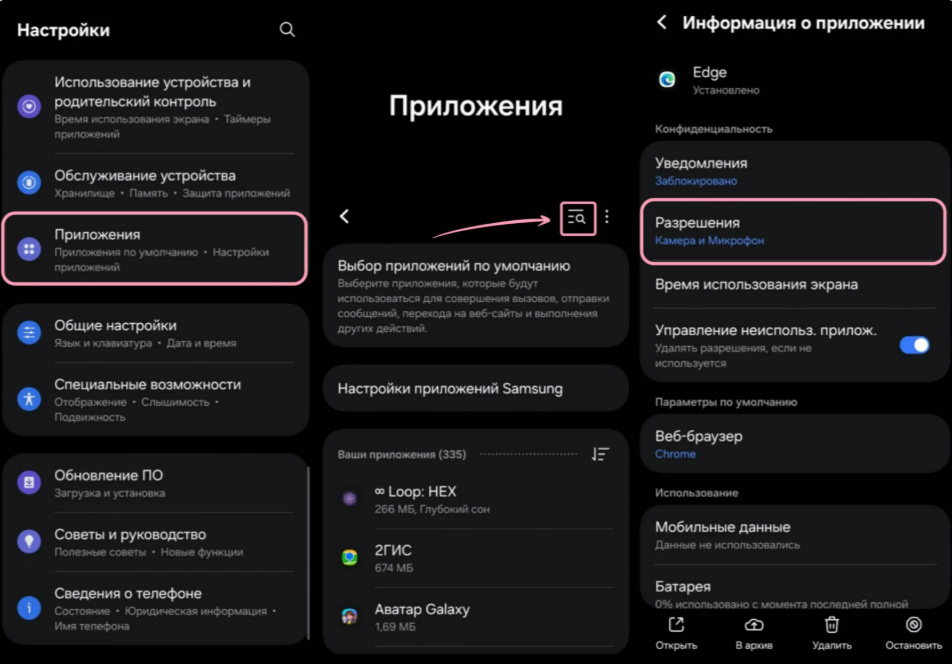 Если действия выше не помогли, зайдите в настройки телефона, нажмите «Приложения», найдите свой браузер и откройте «Разрешения». Включите доступ к микрофону и камере. После этого обновите страничку в браузере и проверьте, работают ли устройства.