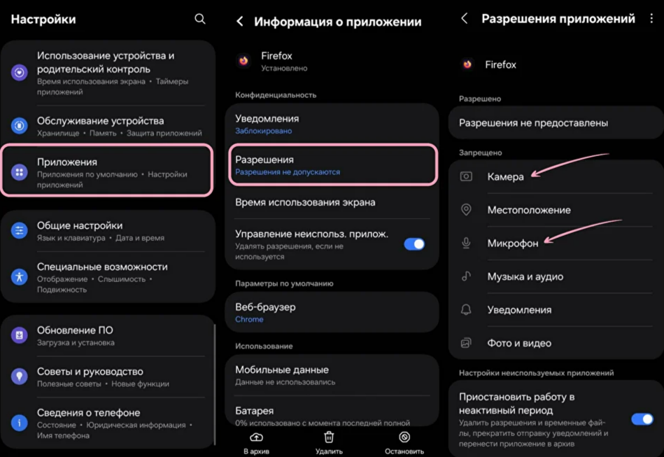 Если вы запретили доступ камере и микрофону в браузере Firefox, включить разрешения можно через настройки телефона. Зайдите в «Приложения», найдите Firefox, перейдите в «Разрешения» и предоставьте доступ для камеры и микрофона. После этого перезагрузите страницу в браузере.