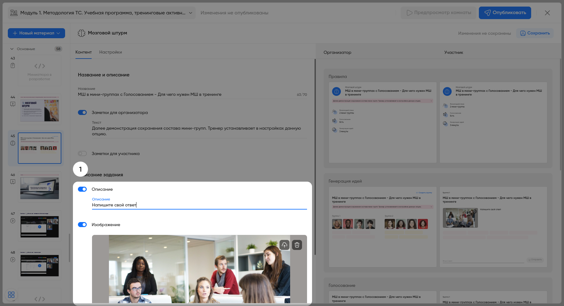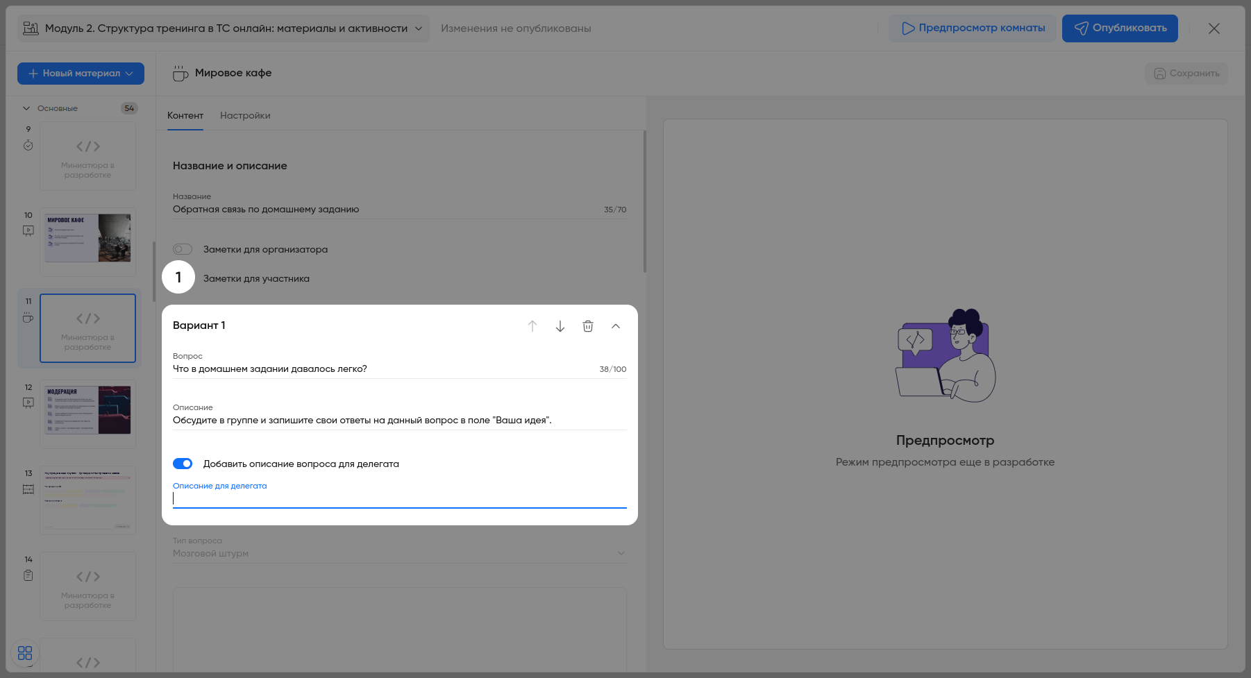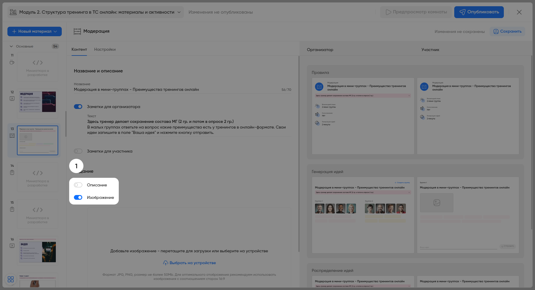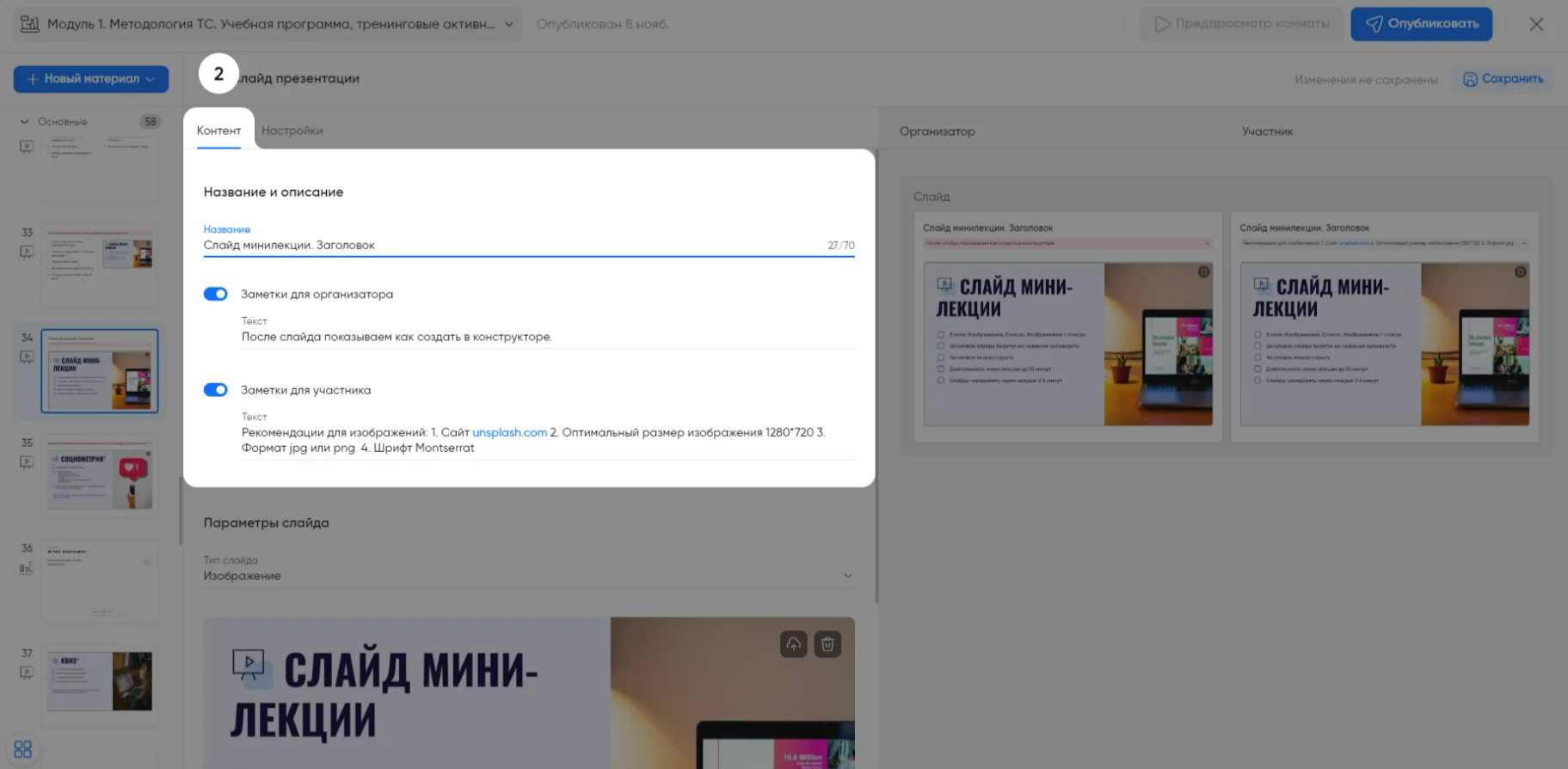 Заполните вкладку «Контент»: название и описание (обязательно), заметки для организатора и заметки для участника (опционально).