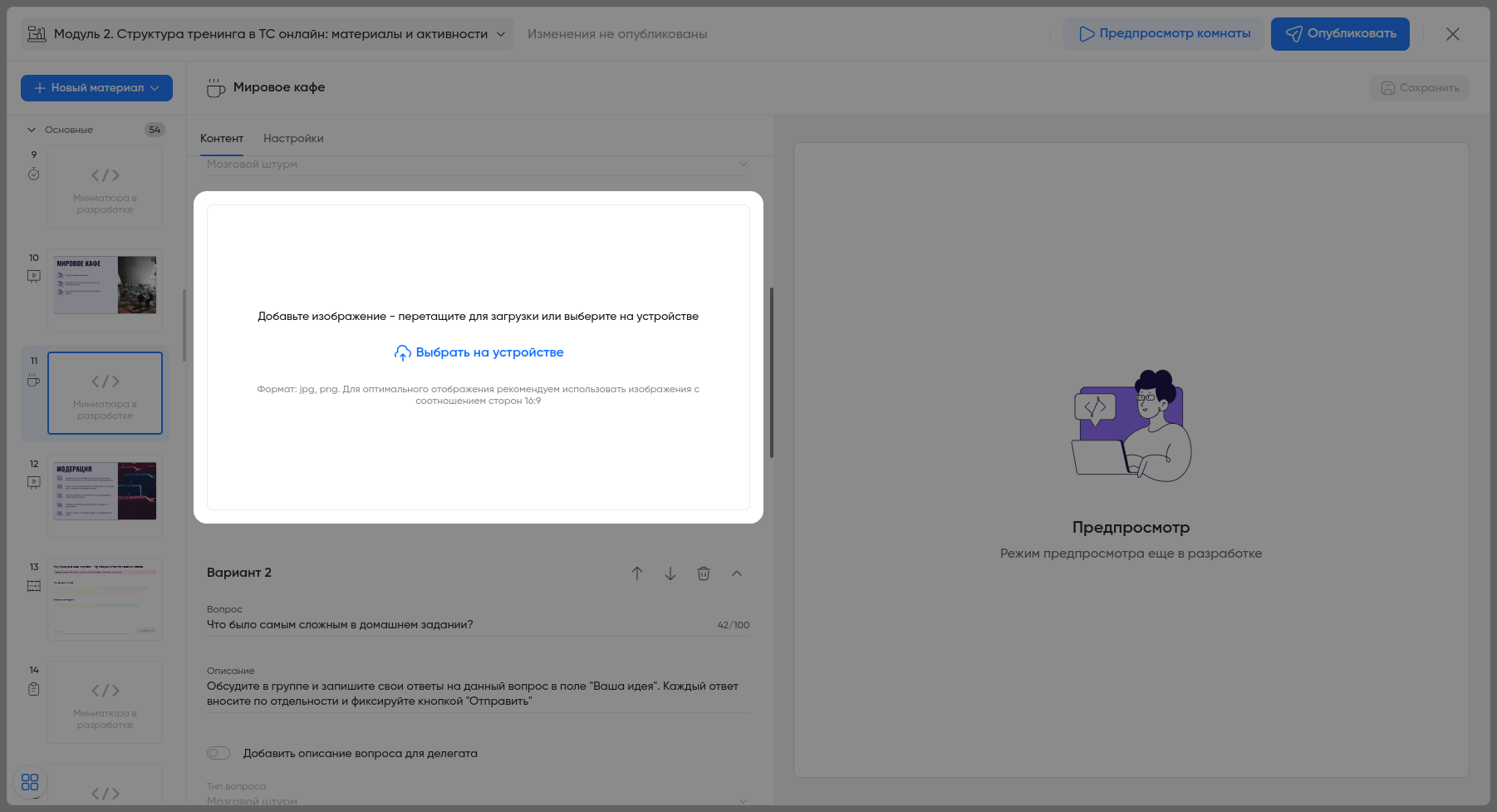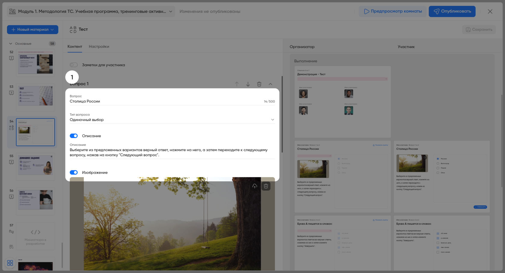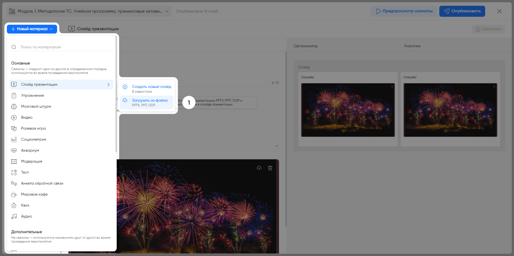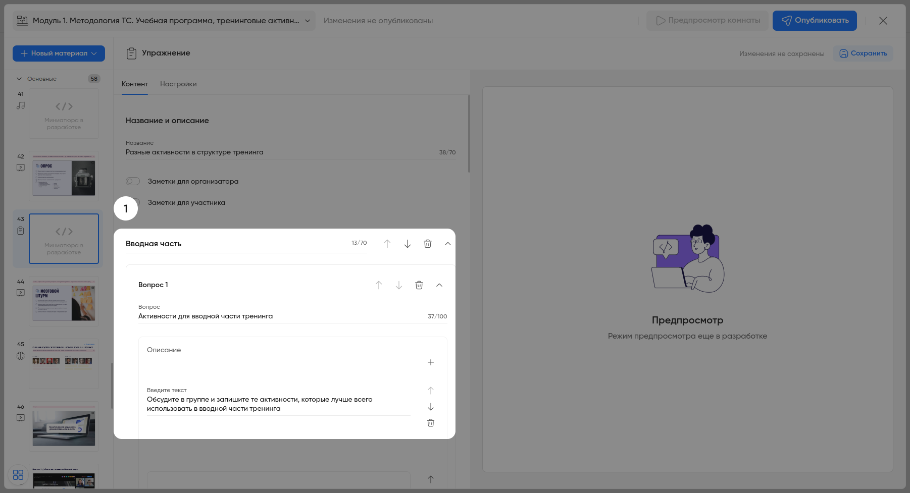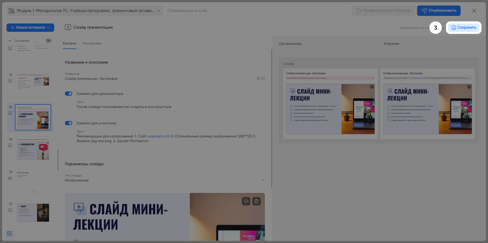 Заполните вкладку «Контент»: название и описание (обязательно), заметки для организатора и заметки для участника (опционально).