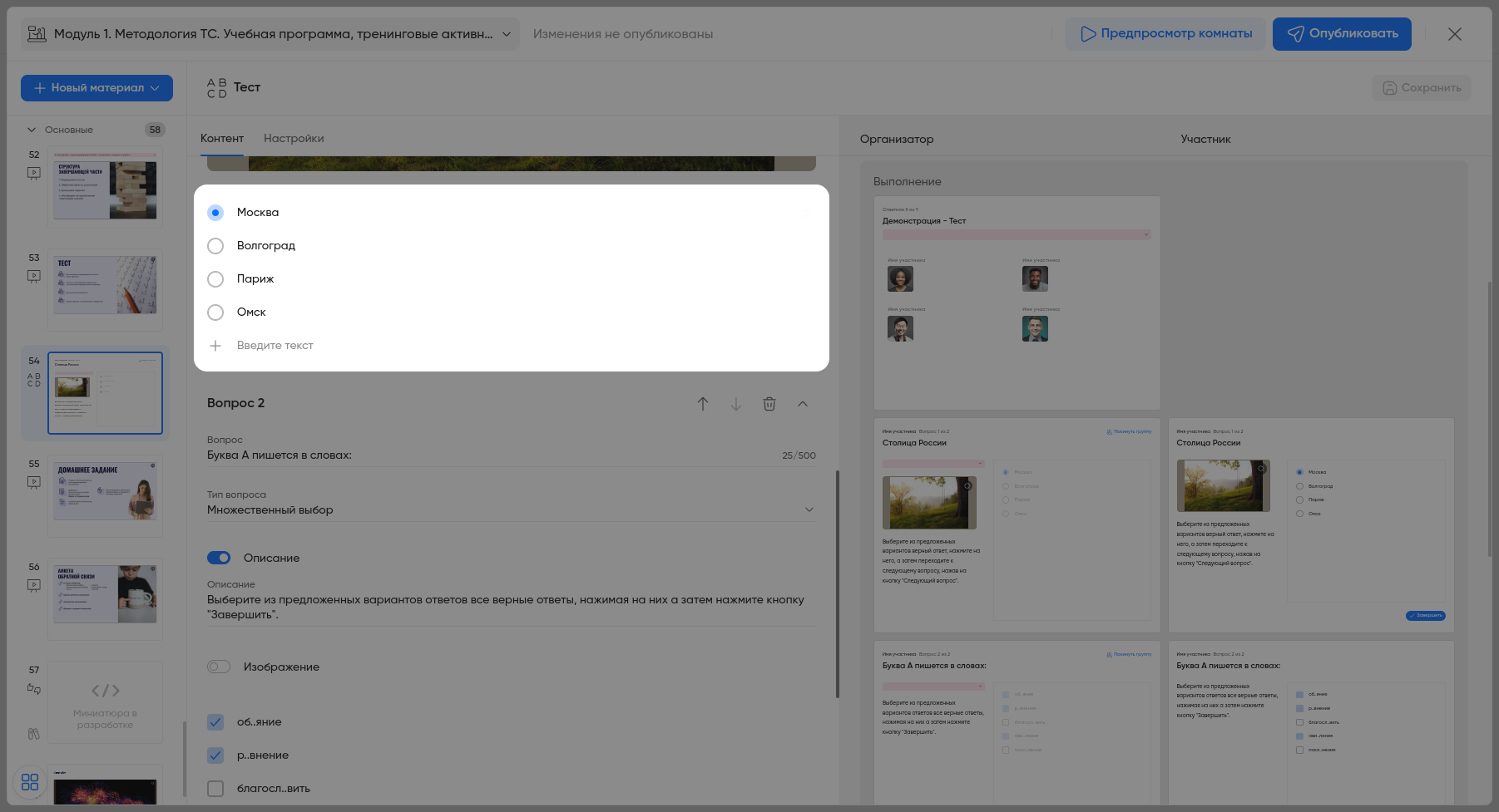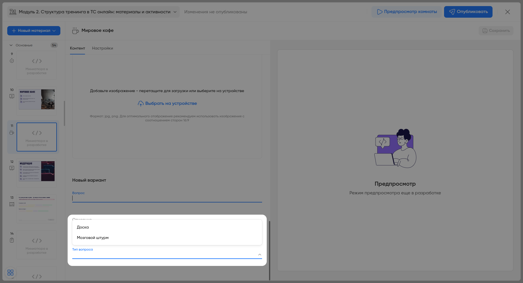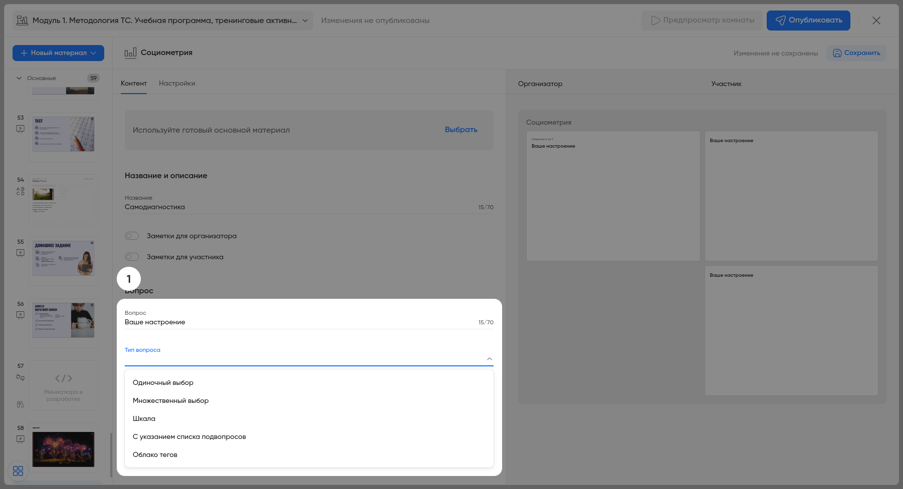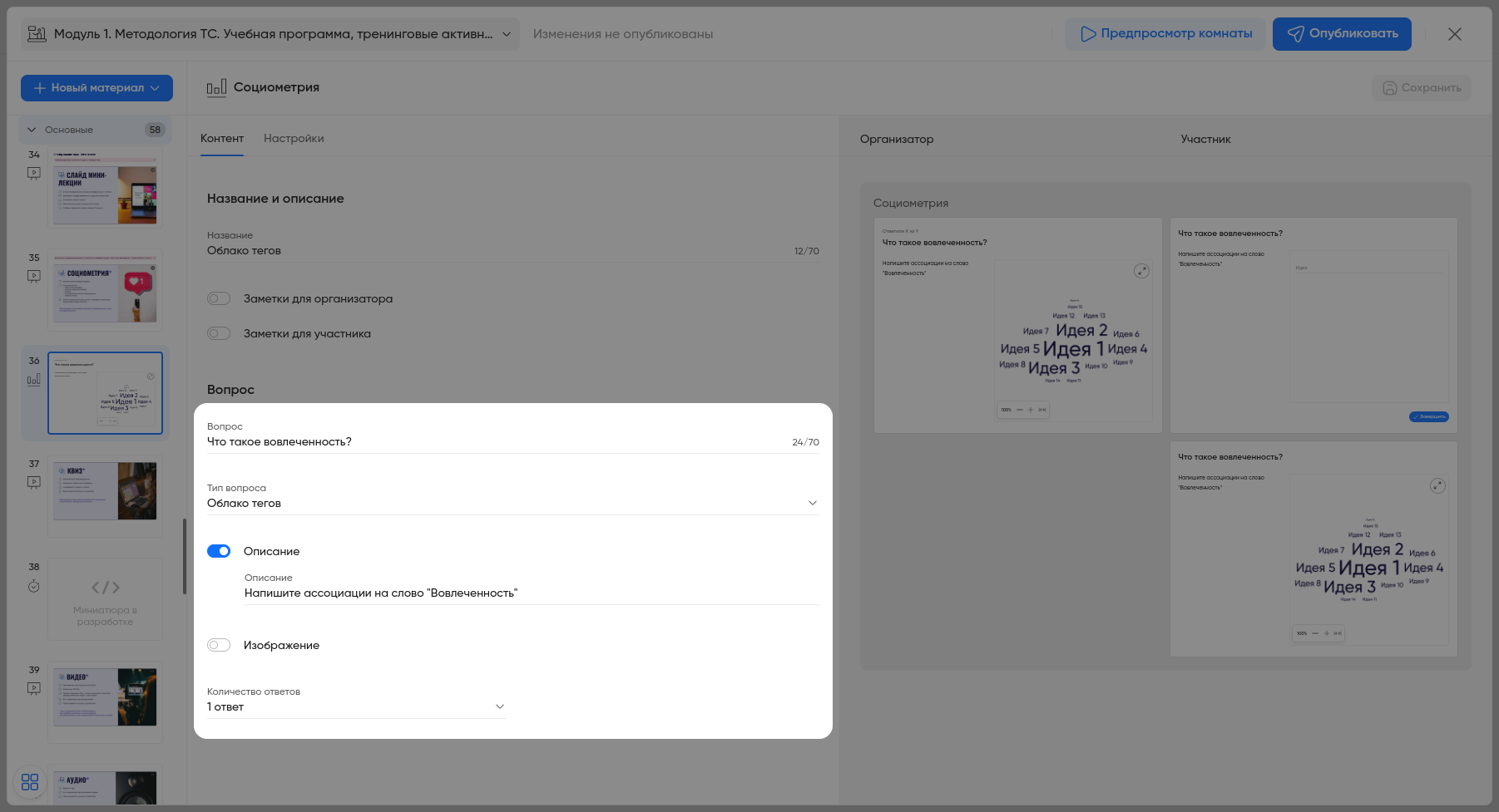 Заполните вкладку «Контент»: название и описание (обязательно), заметки для организатора и заметки для участника (опционально).