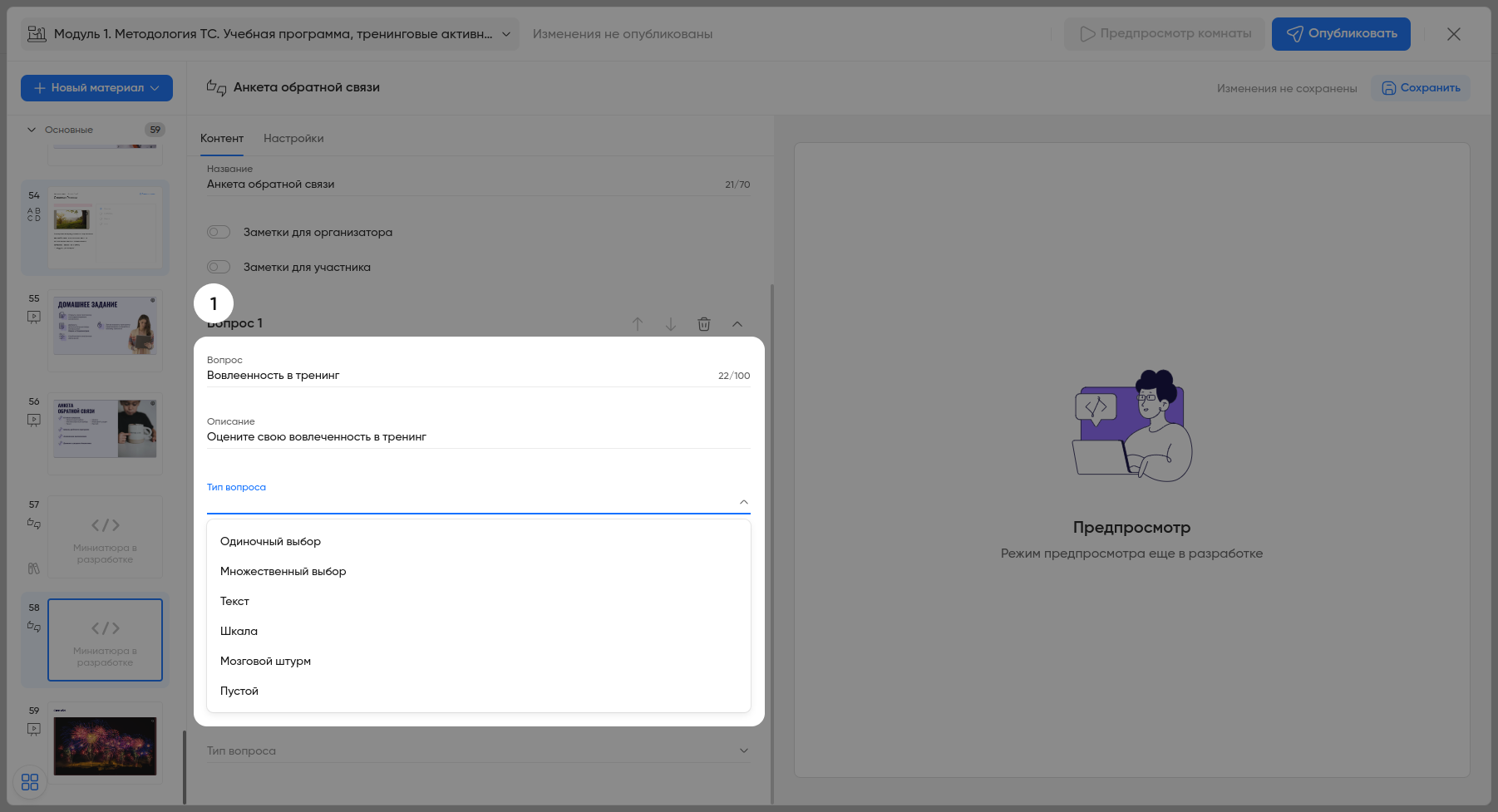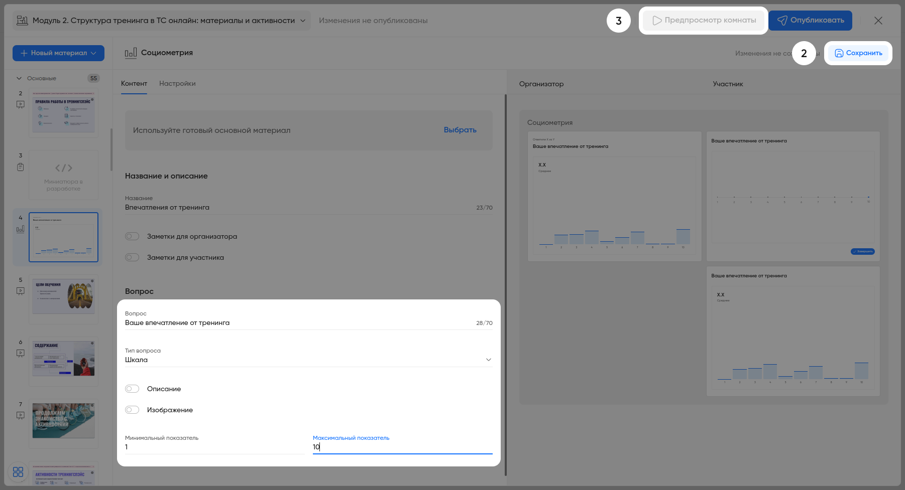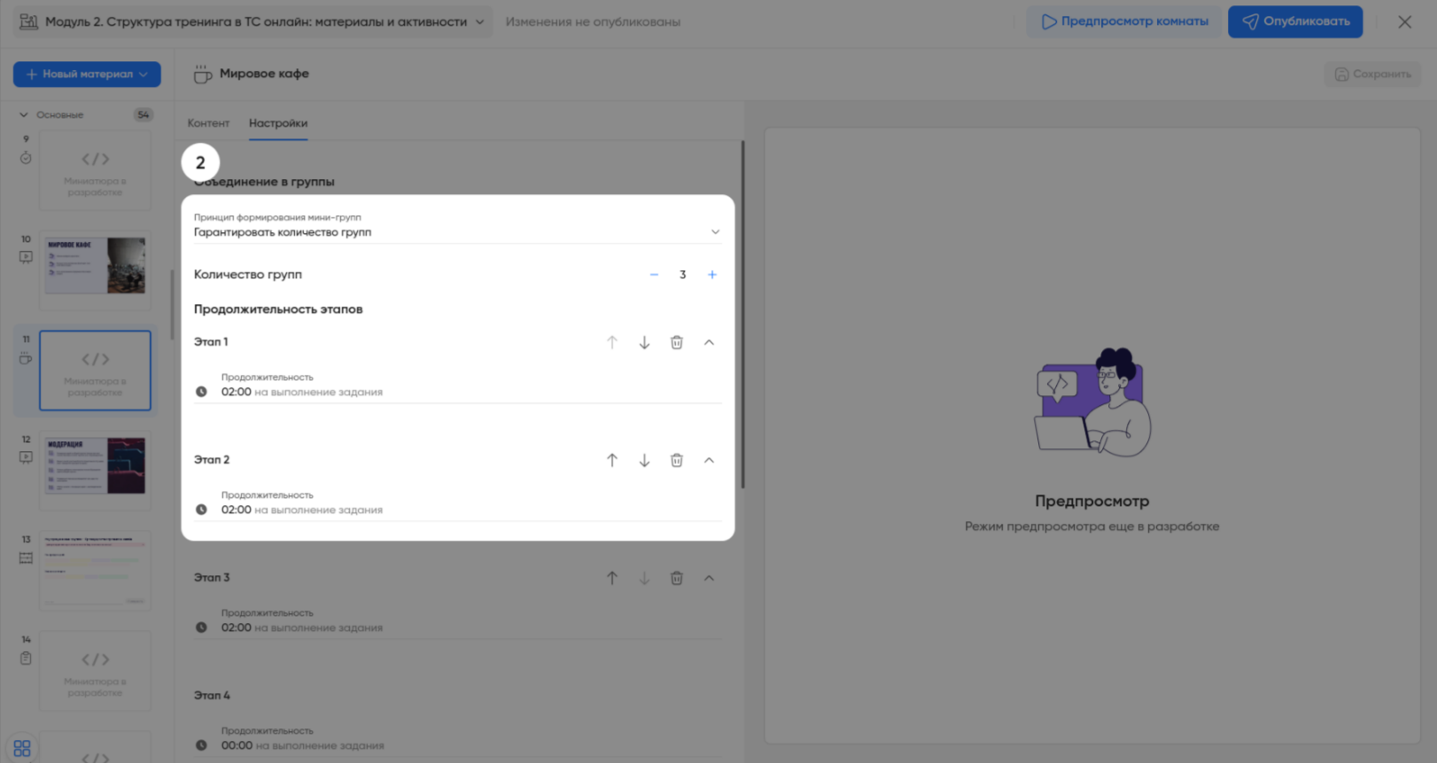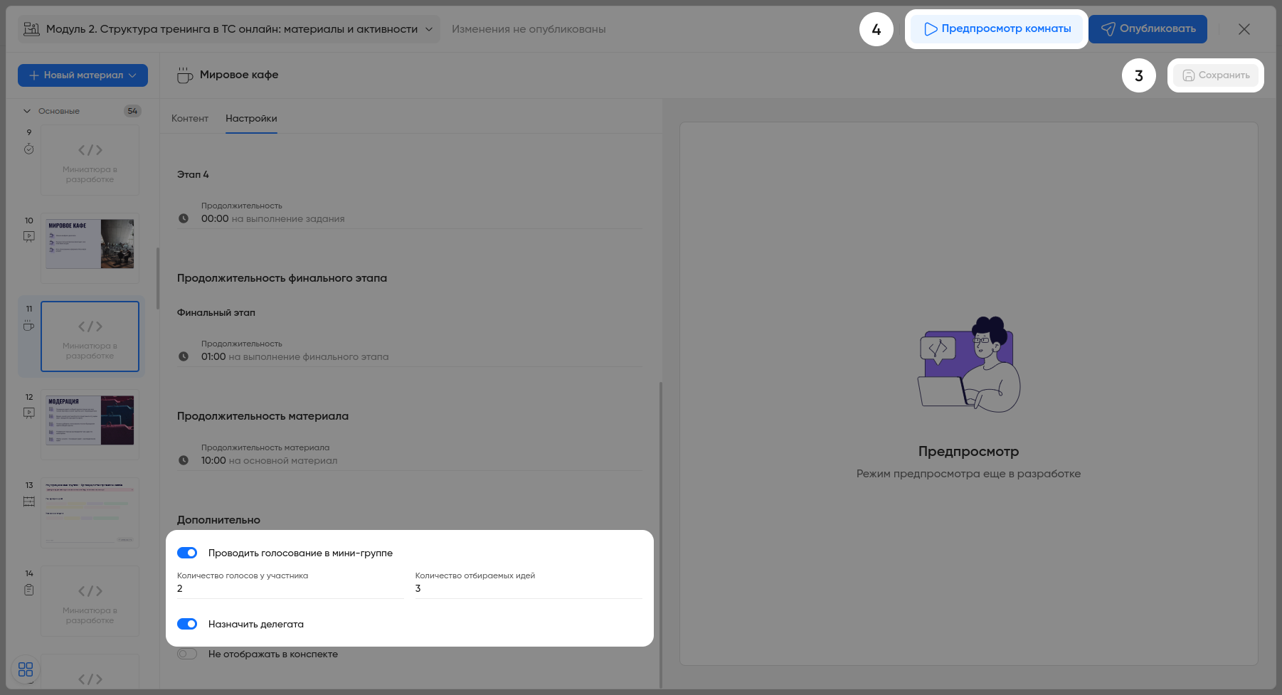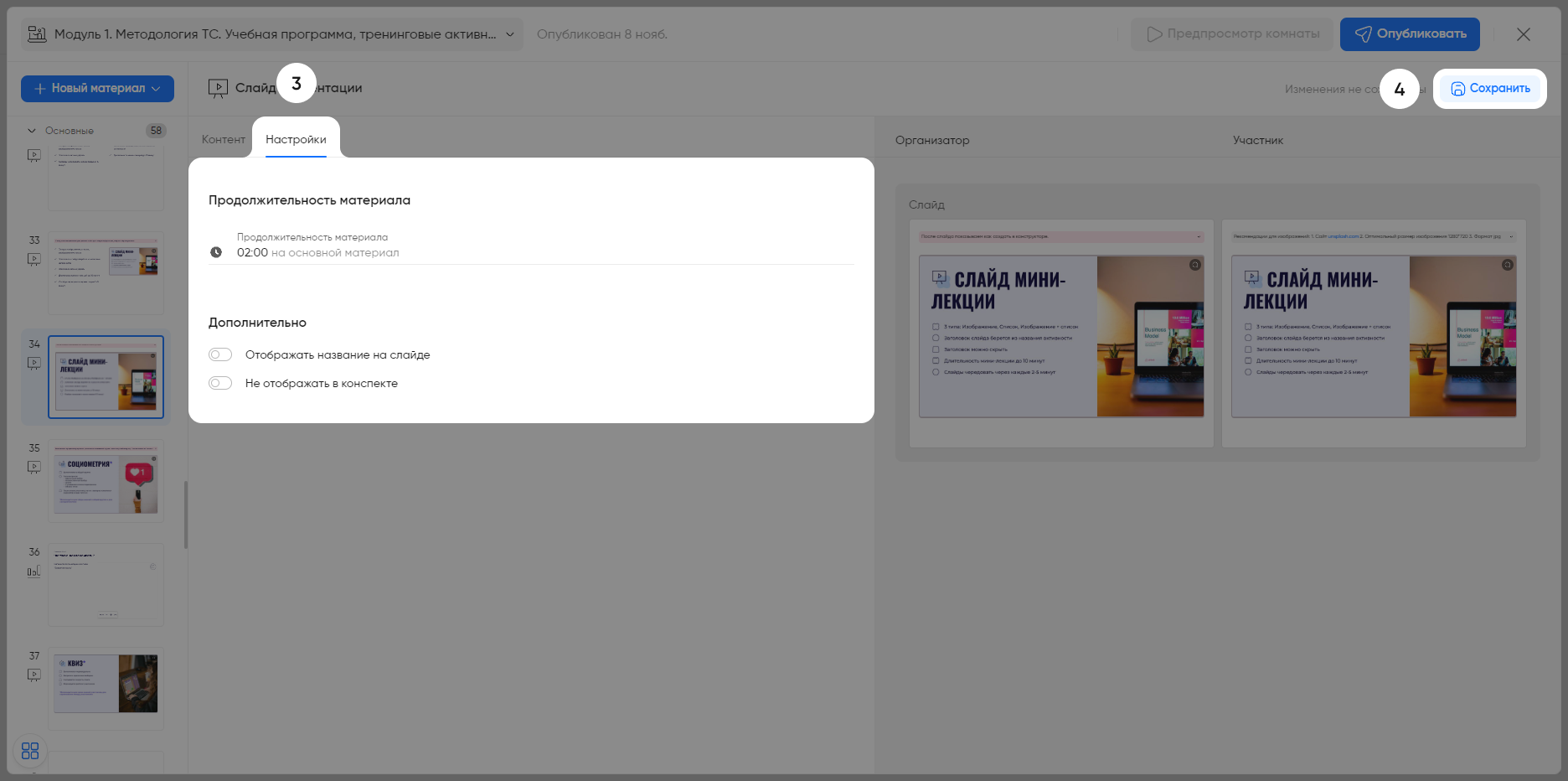 Заполните вкладку «Настройки»: продолжительность и отображение в конспекте (опционально).