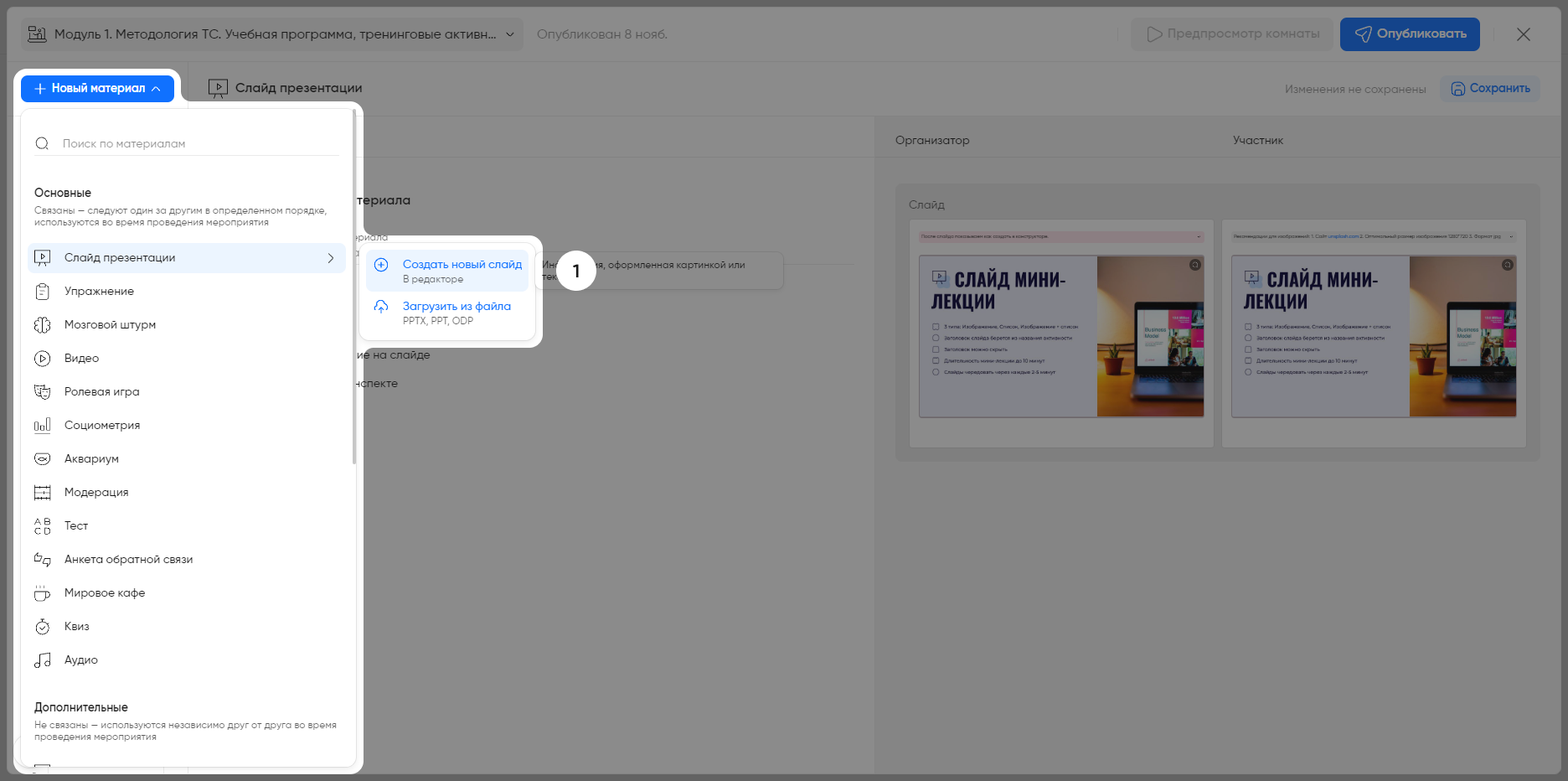 Нажмите на кнопку «Новый материал» и выберите материал из раздела «Основные».