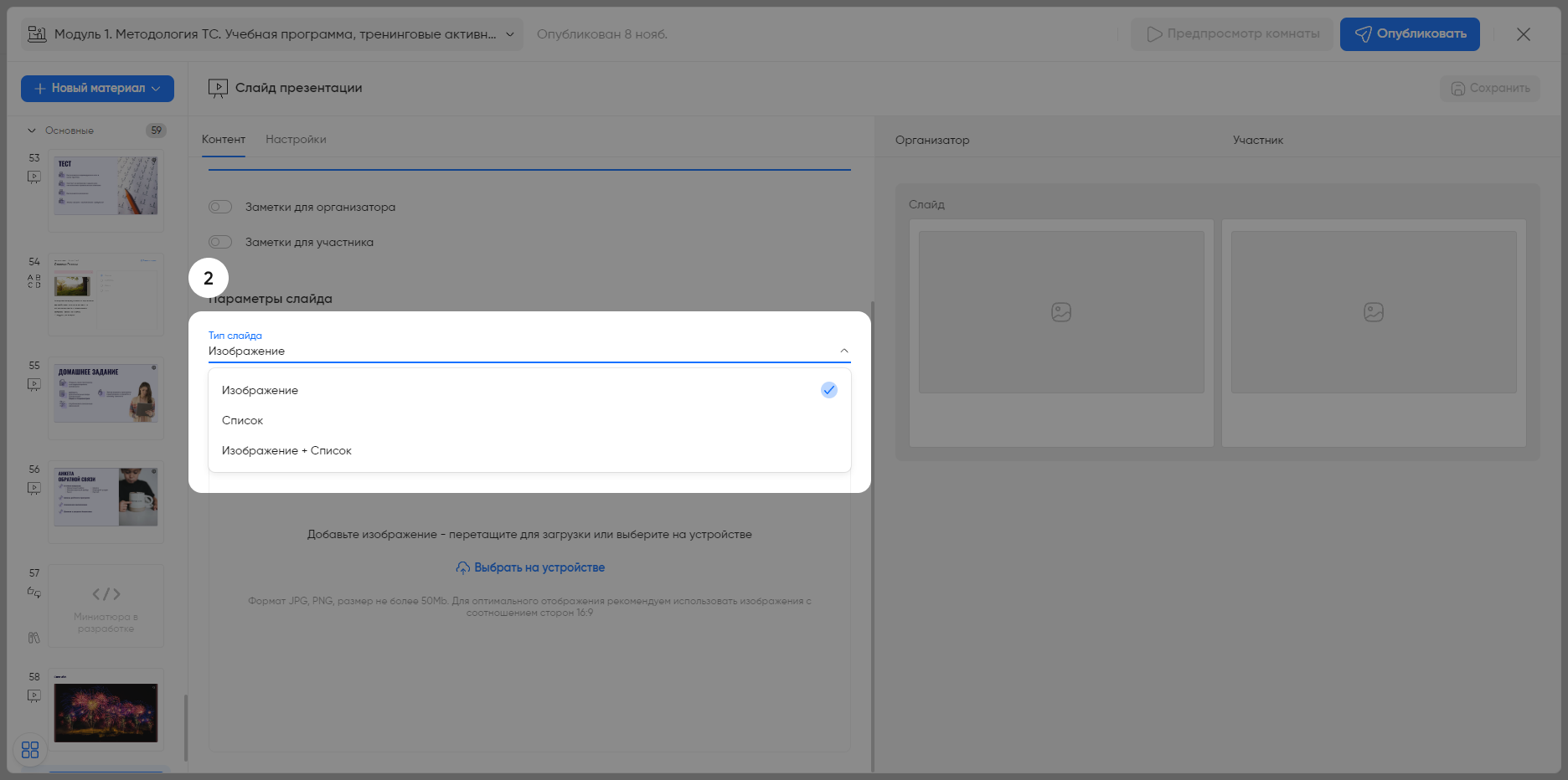 Выберите тип слайда из трех вариантов: изображение, список, изображение + список.