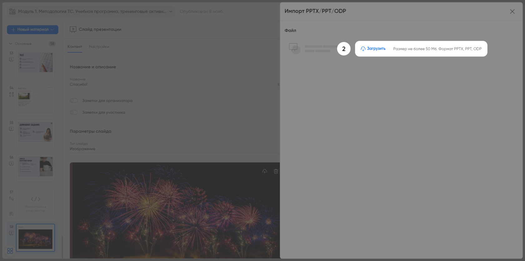 Нажмите кнопку «Загрузить» выберите презентацию формата PPTX, PPT, ODP размером не более 50 мб с вашего устройства.