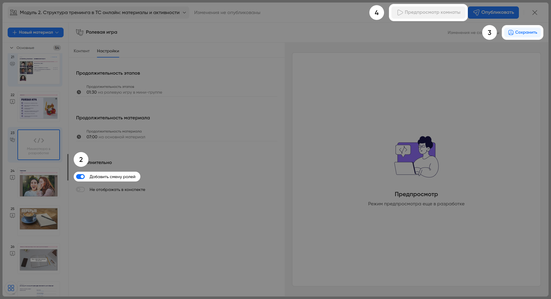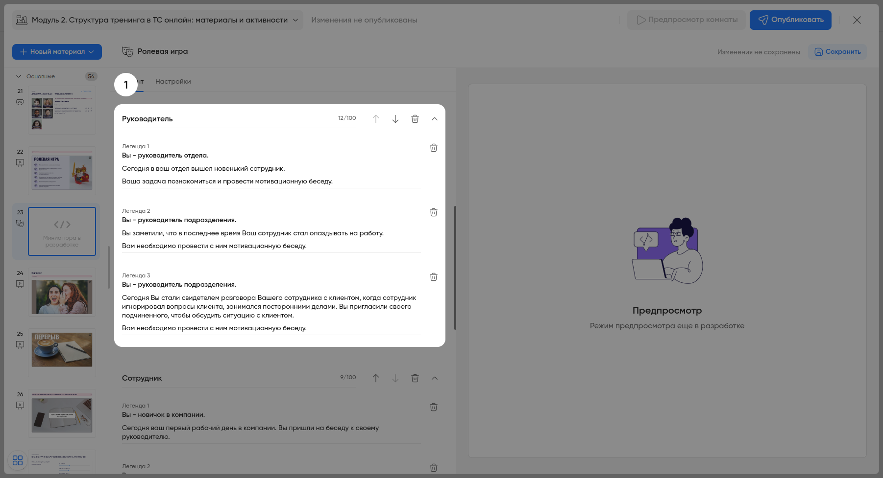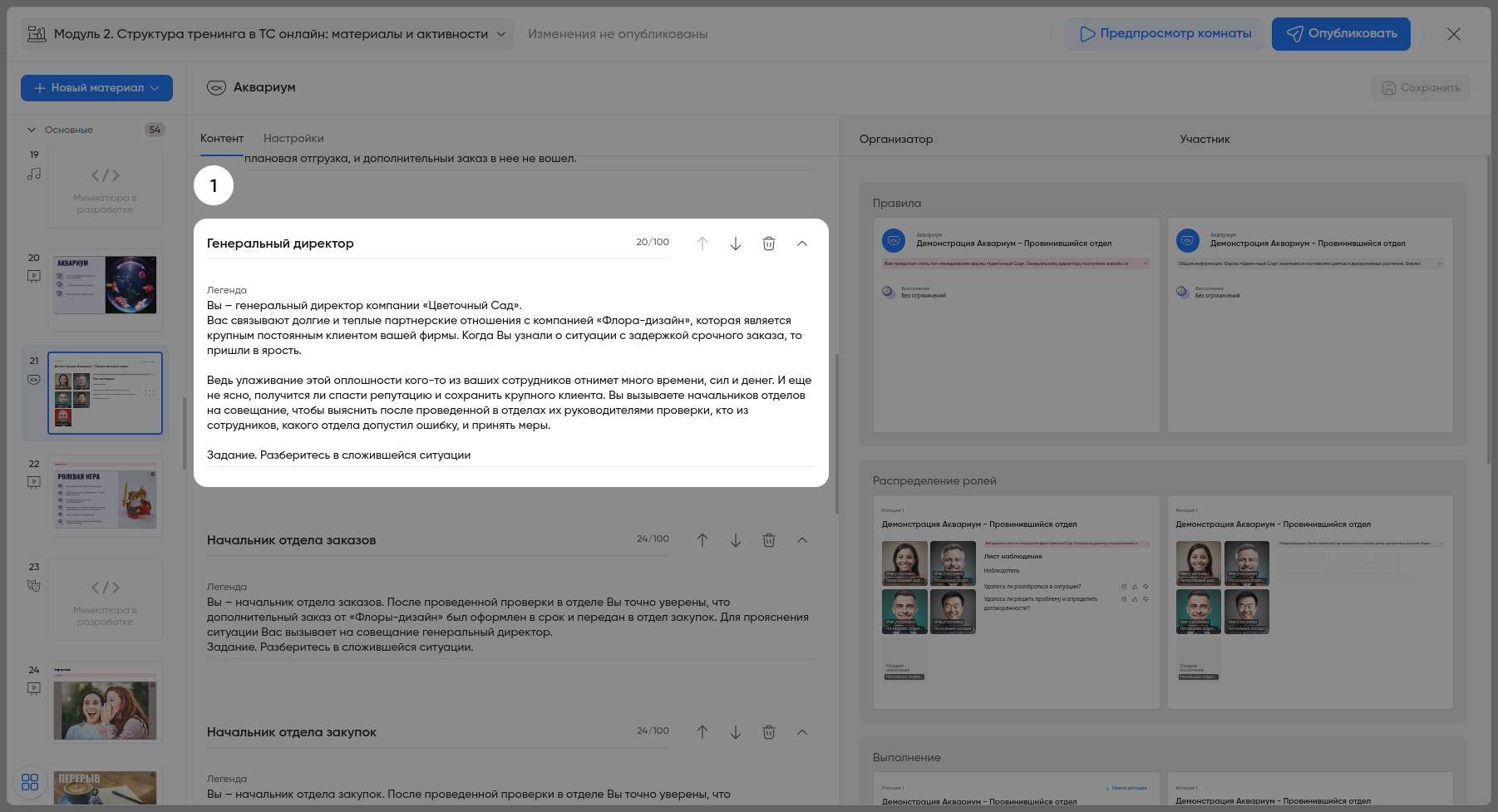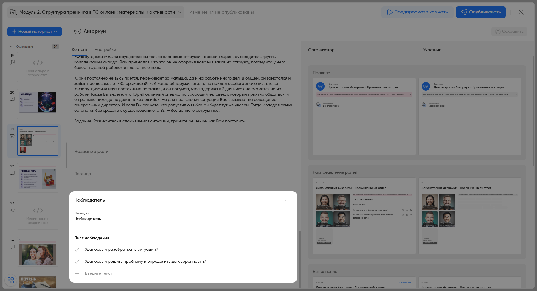 Настройте смену ролей (опционально), добавьте легенды ролевым участникам, если предусмотрена смена ролей.