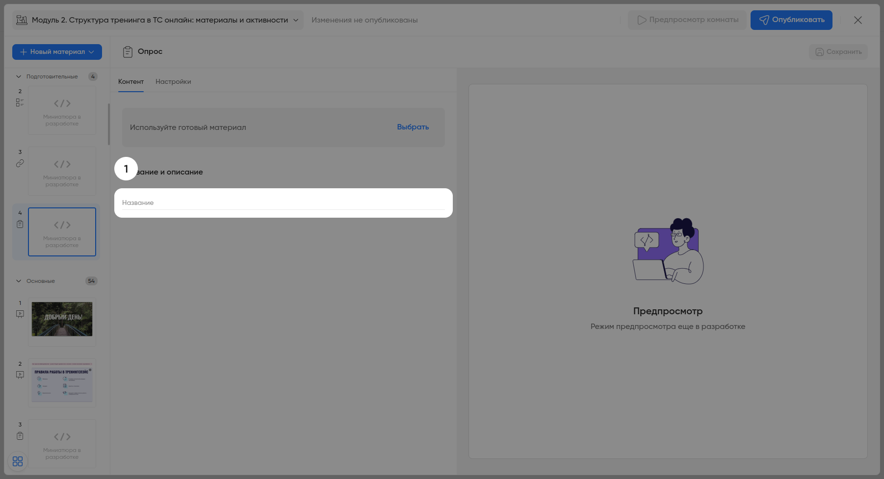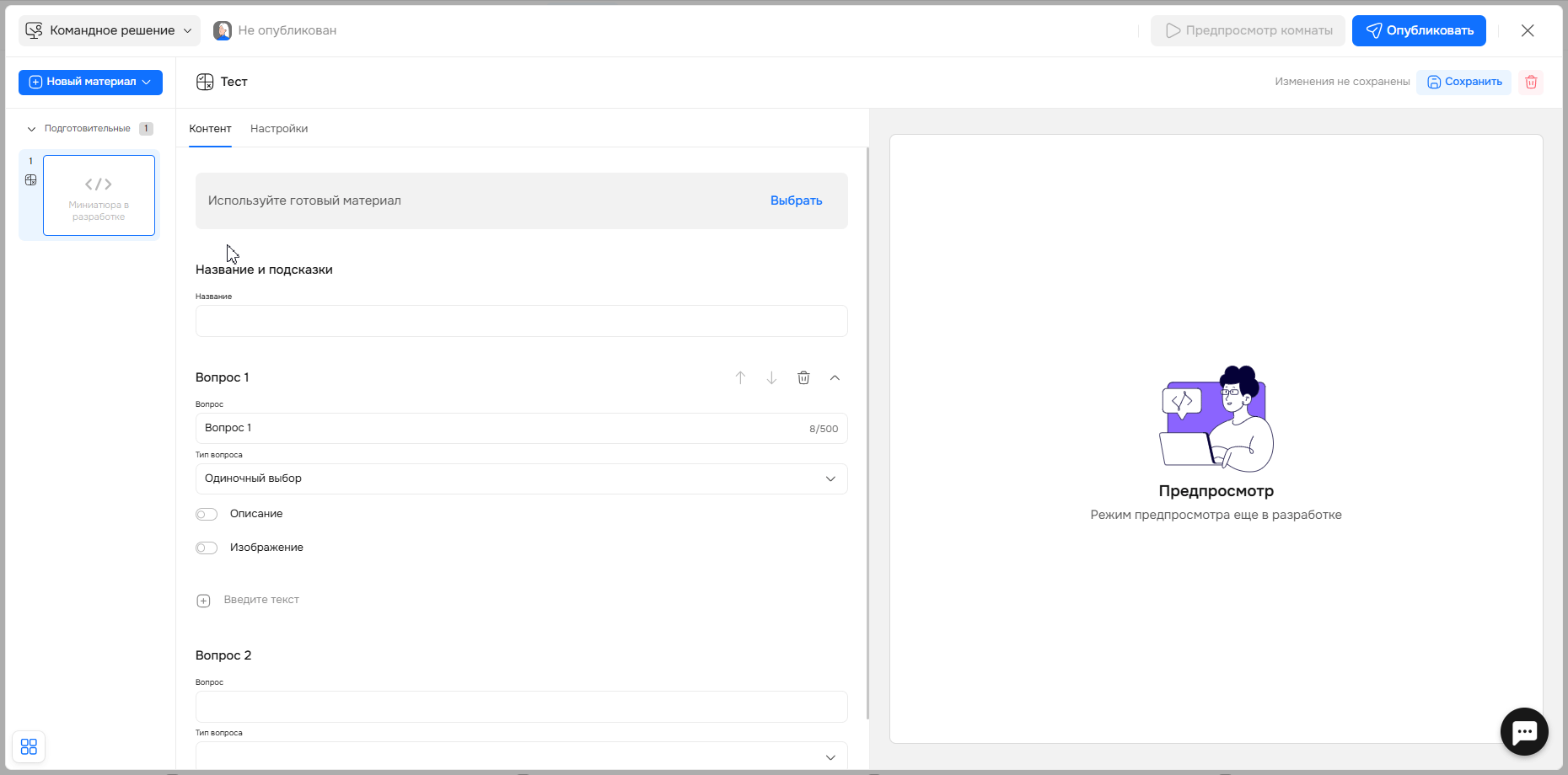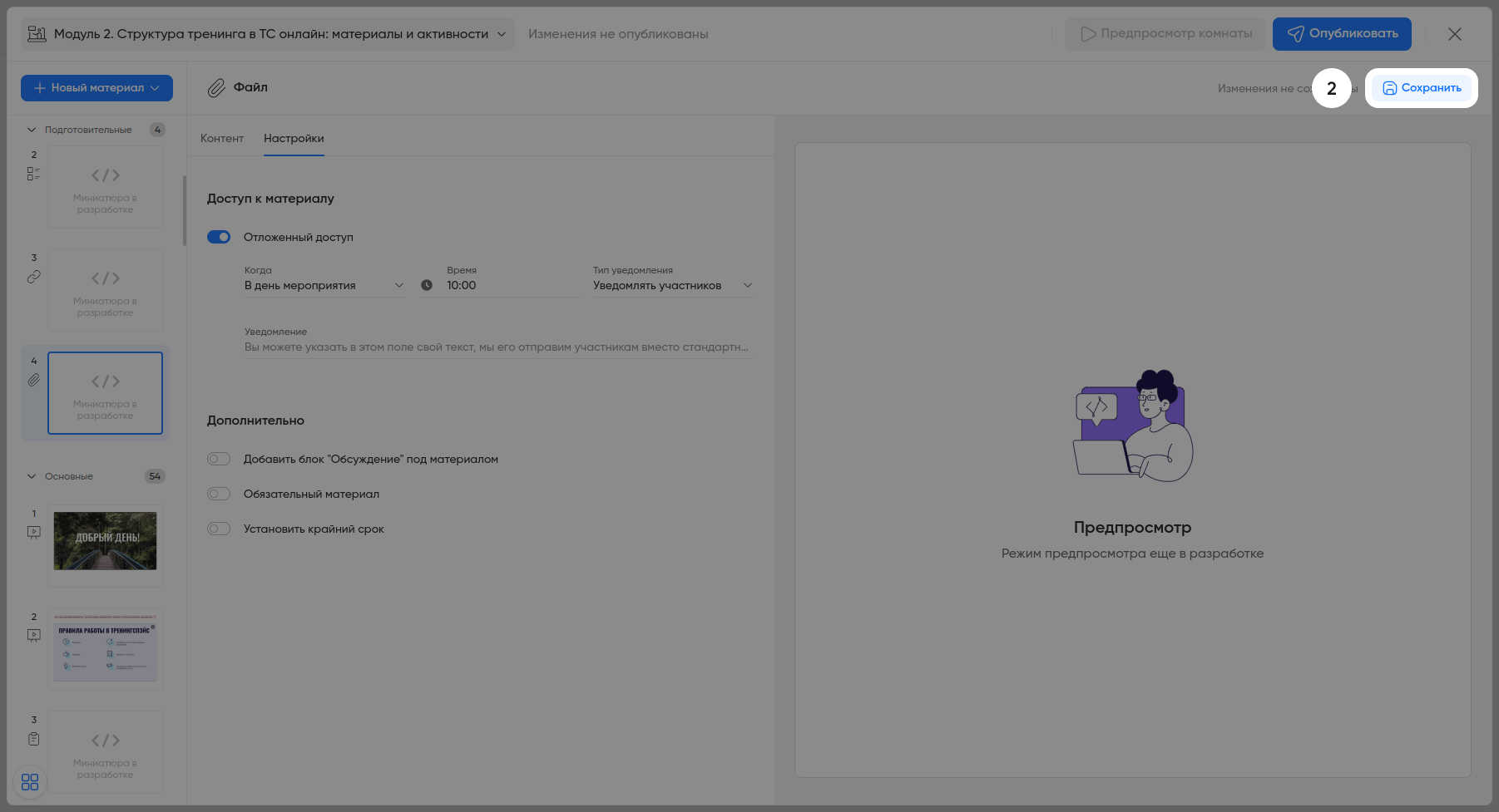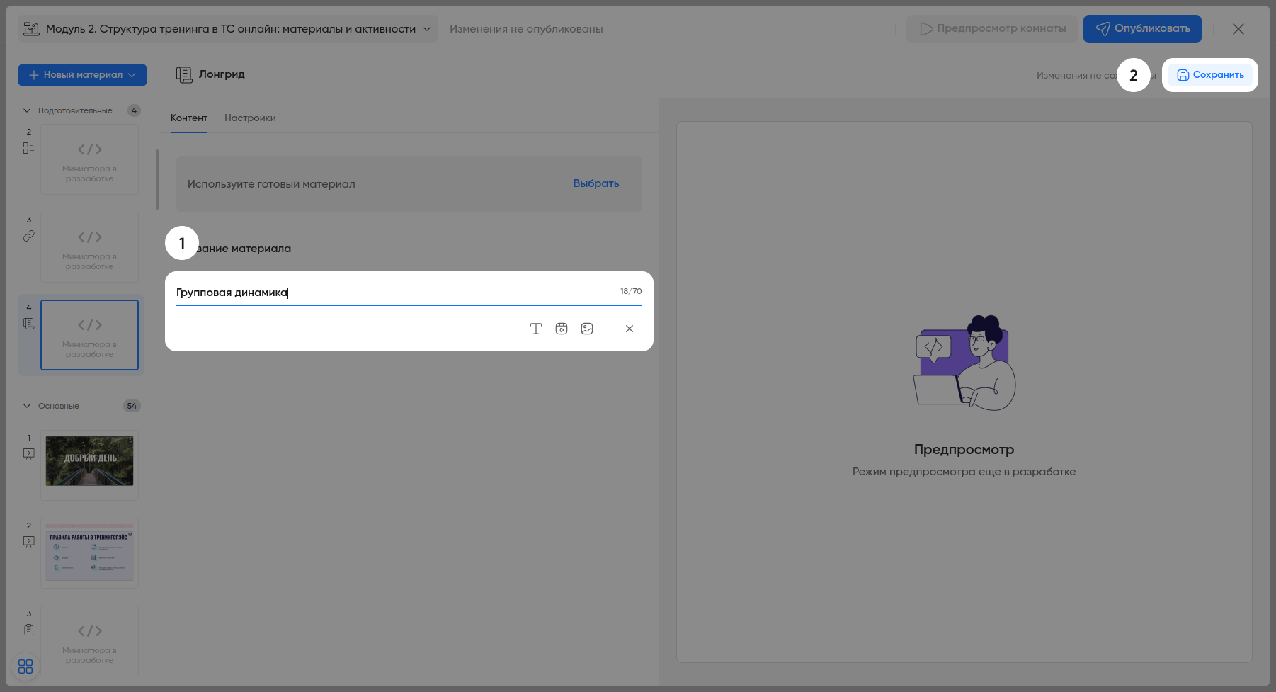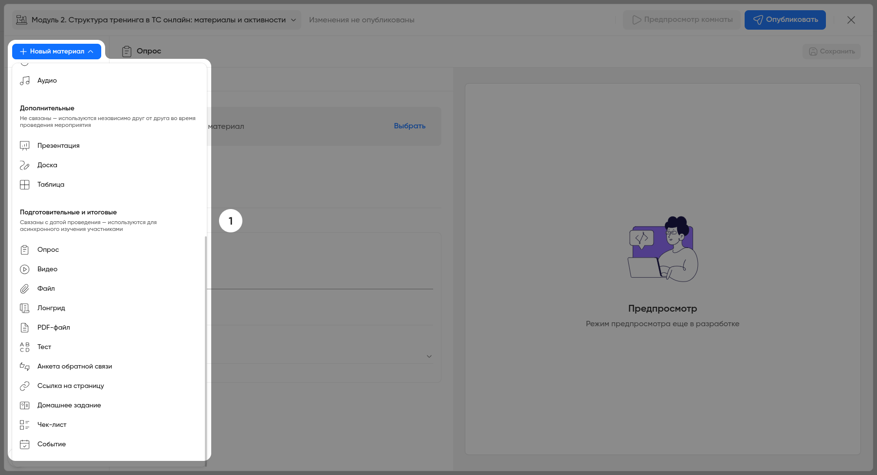 Нажмите на кнопку «Новый материал» и выберите материал из раздела «Подготовительные и итоговые».