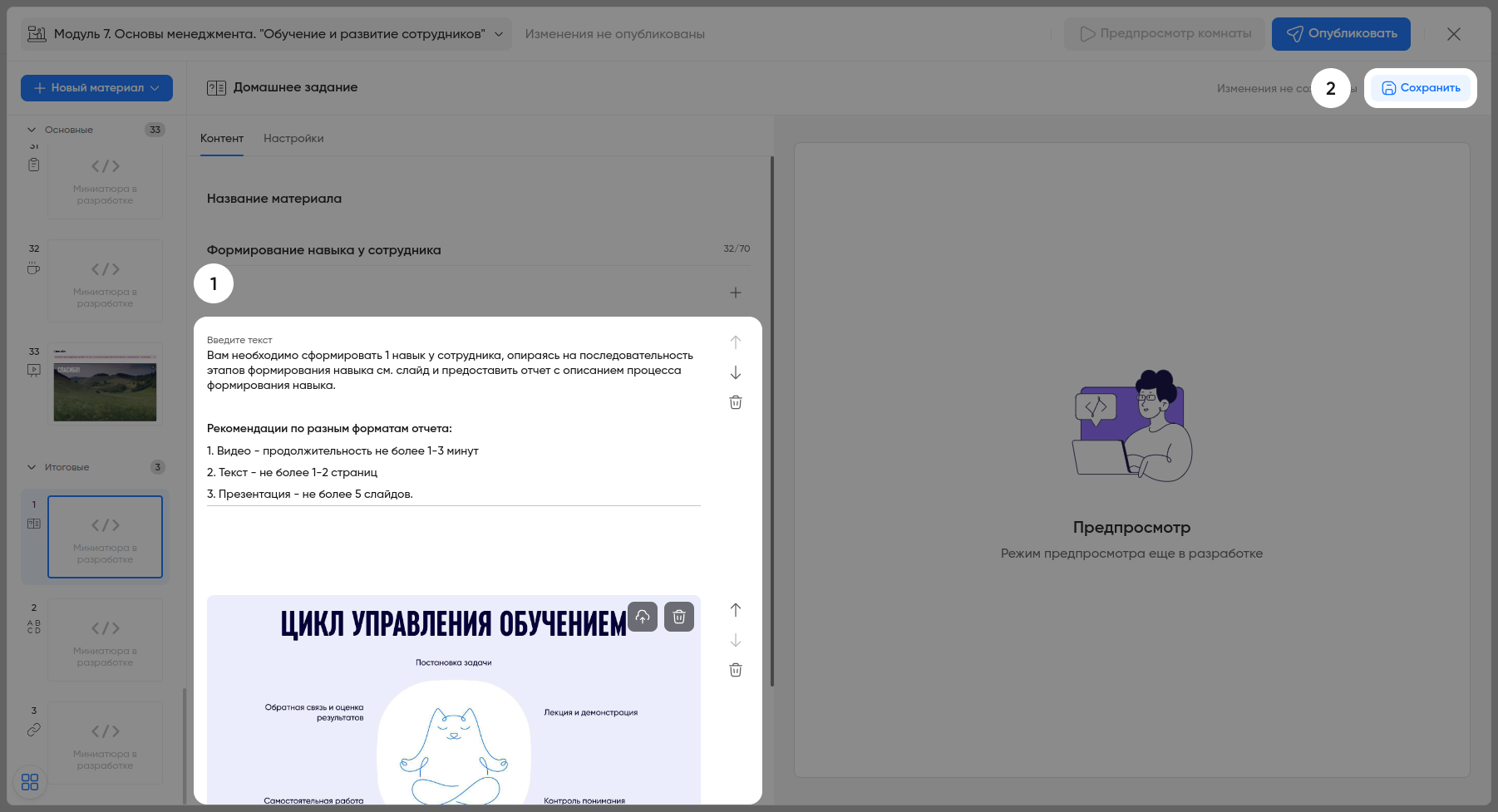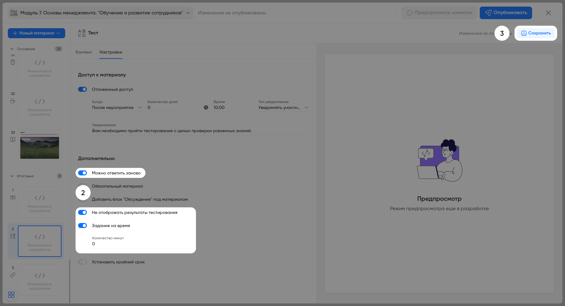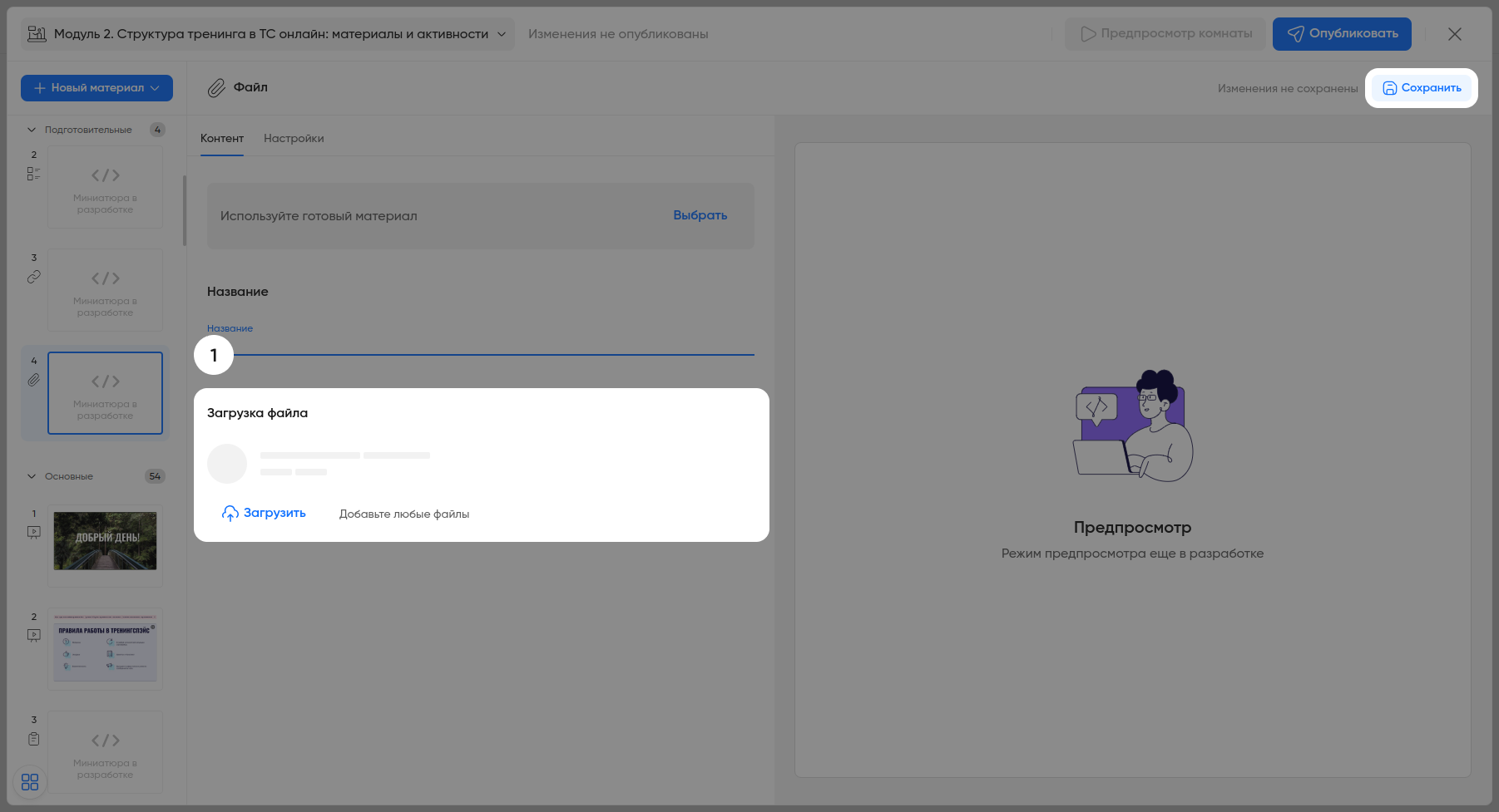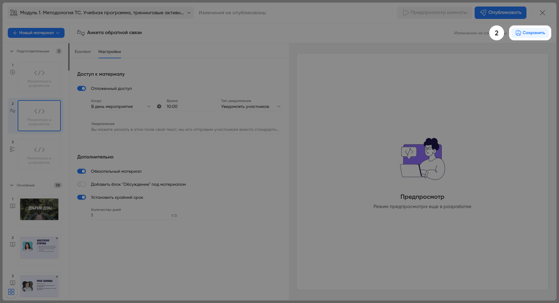 Нажмите на кнопку «Новый материал» и выберите материал из раздела «Подготовительные и итоговые».