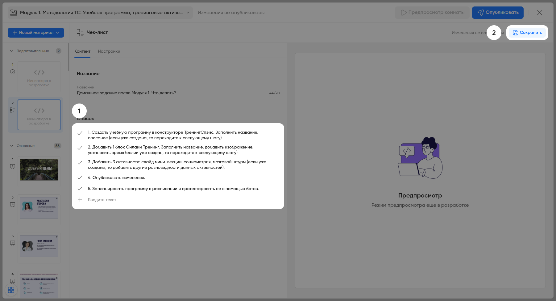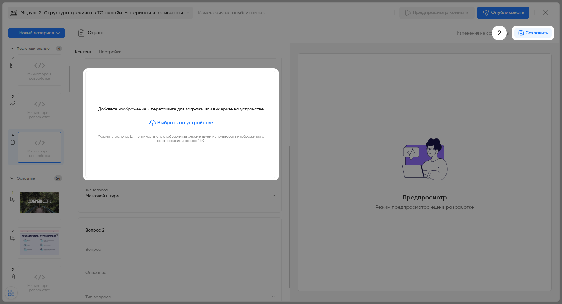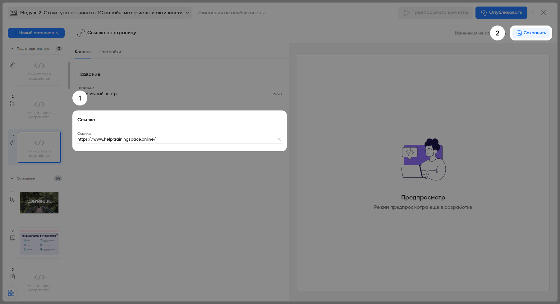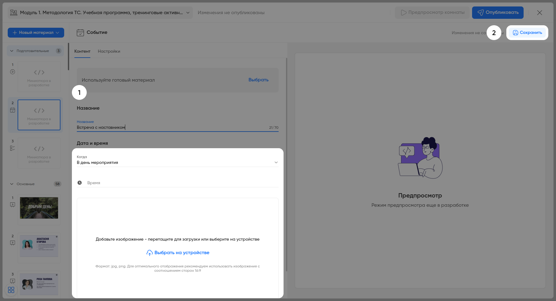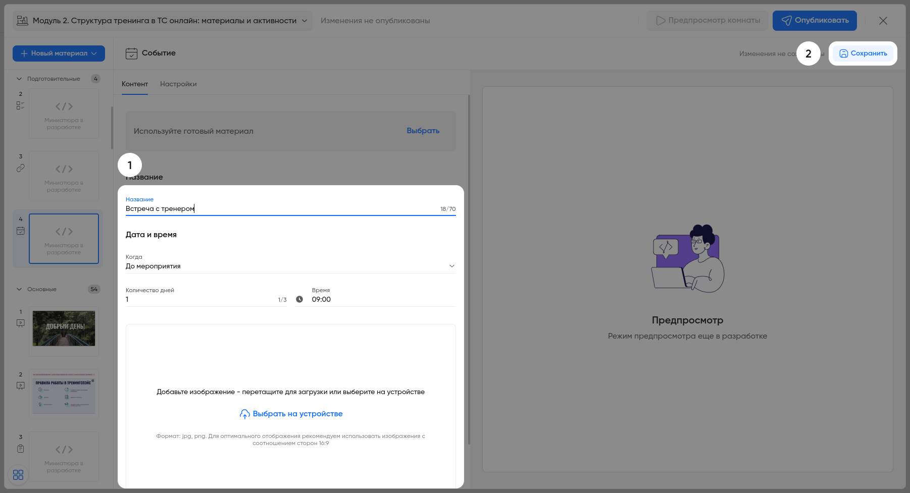 Нажмите на кнопку «Новый материал» и выберите материал из раздела «Подготовительные и итоговые».