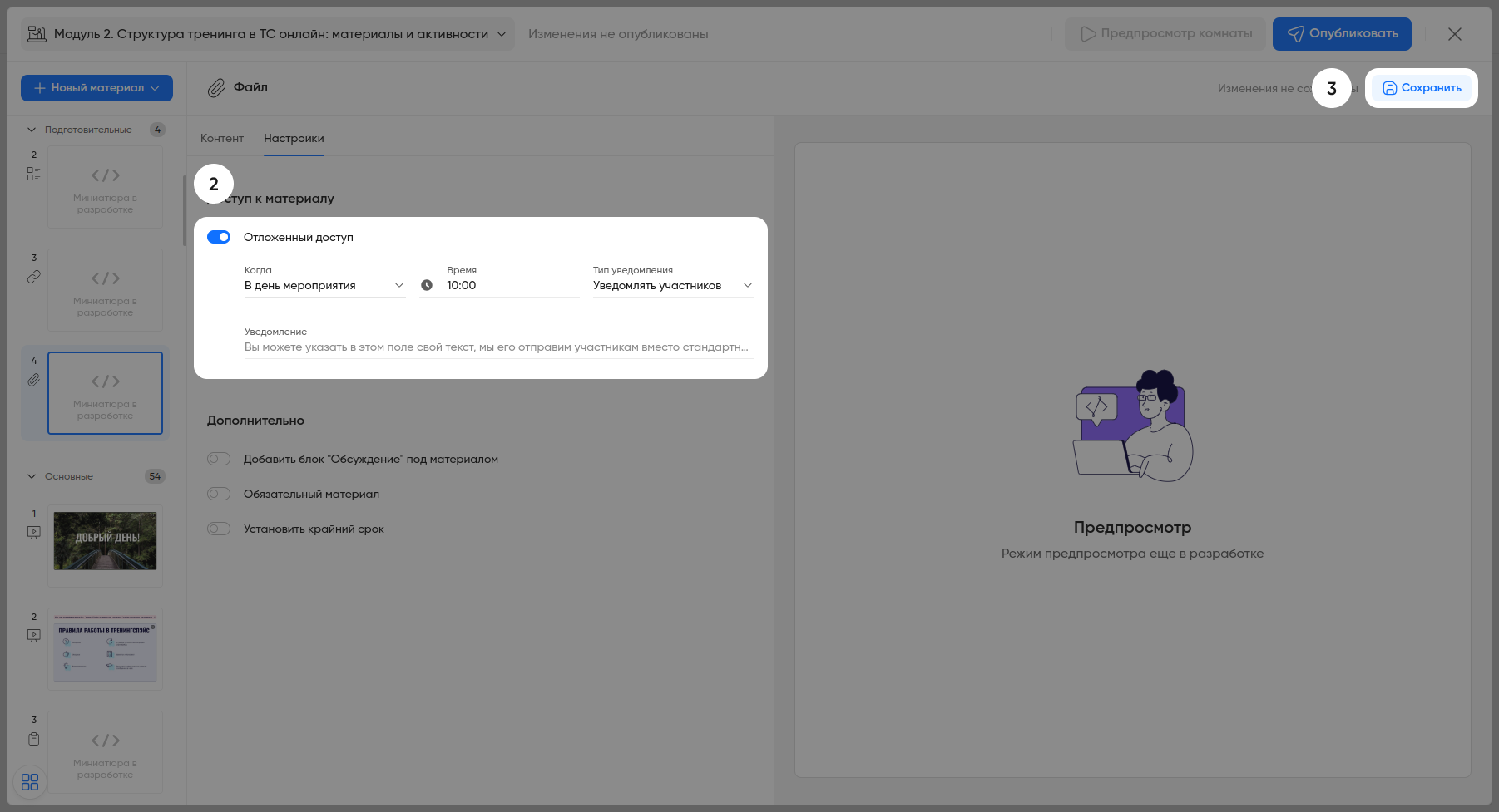 - отложенный доступ — дата, время, уведомление участникам (обязательно);