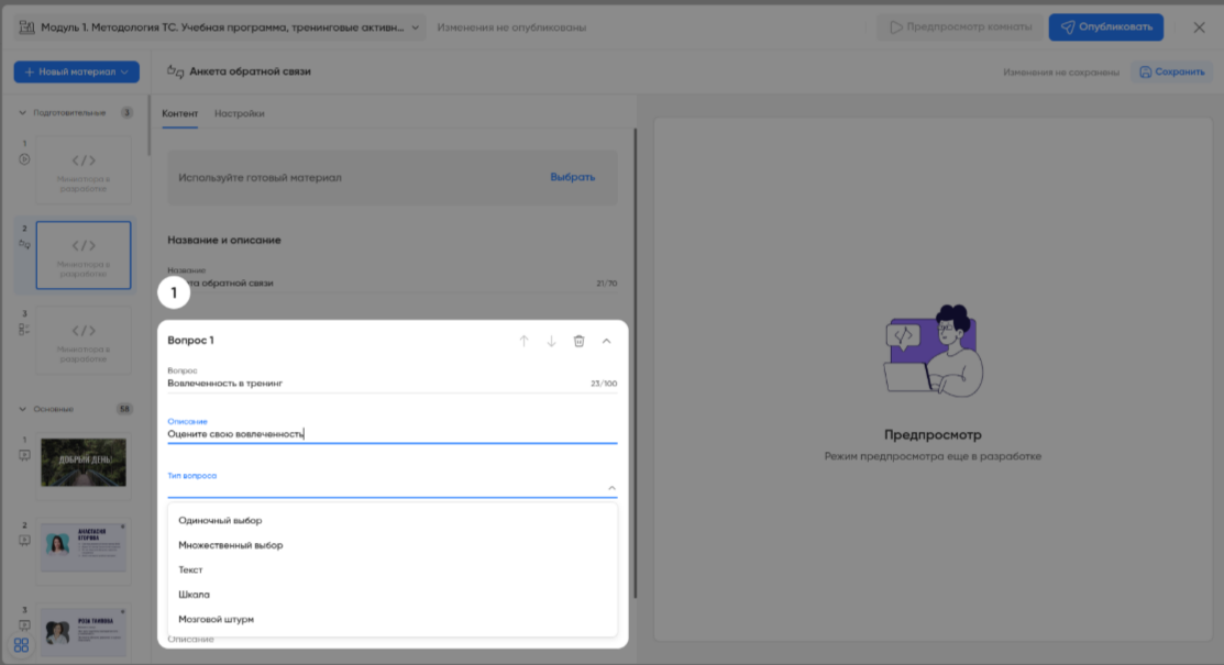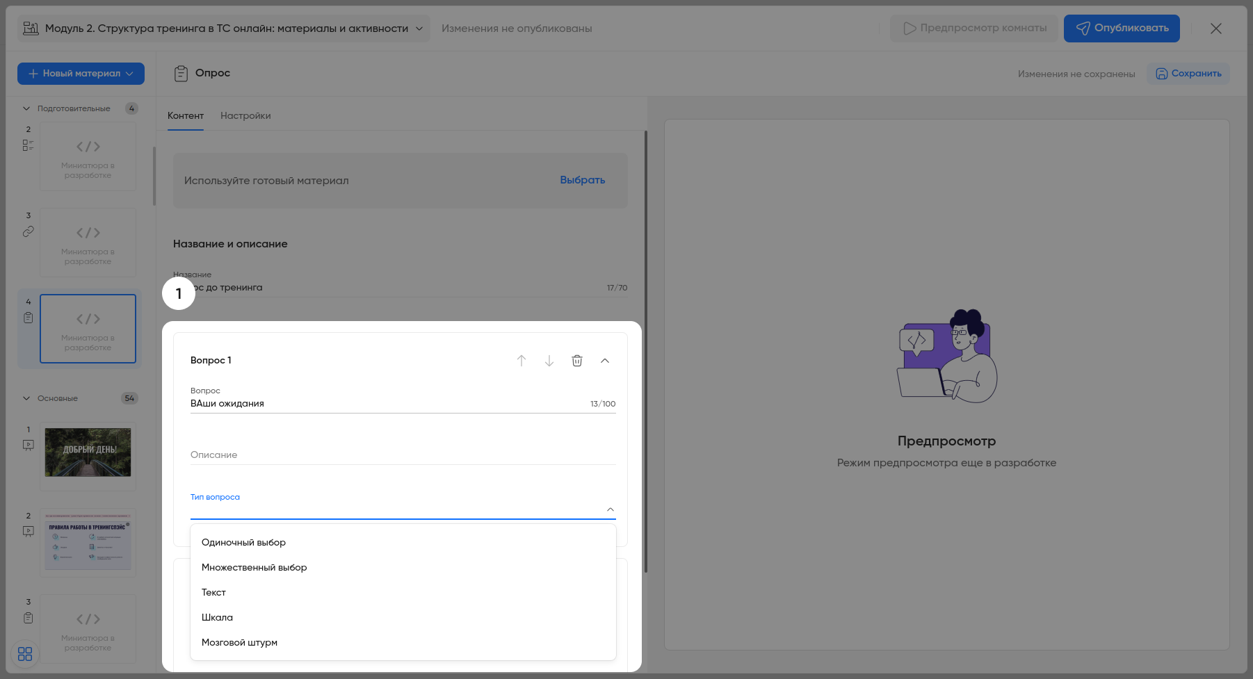- тип вопроса из 5 предложенных — одиночный или множественный выбор, текст, шкала, мозговой штурм;