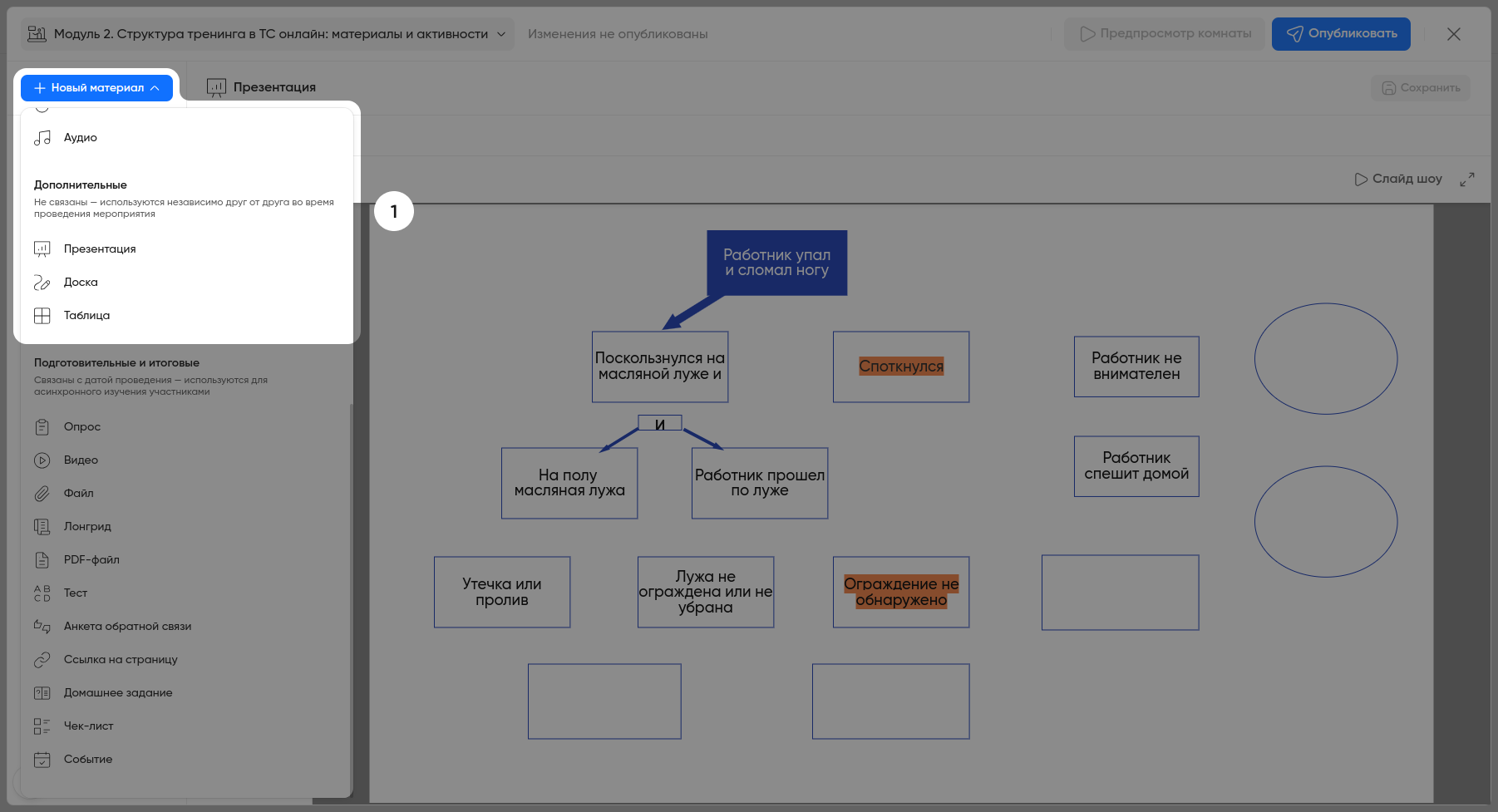 Нажмите на кнопку «Новый материал» и выберите материал из раздела «Дополнительные».