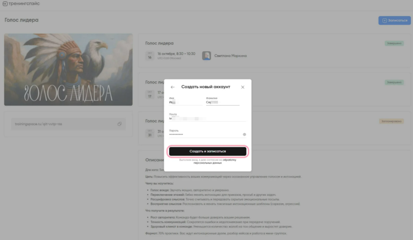 При самостоятельном создании аккаунта укажите фамилию, имя, действующую почту, придумайте или сгенерируйте пароль и нажмите «Создать и записаться». Ваш аккаунт будет закреплен за организацией. После этого вы попадете на страничку мероприятия — для подключения нажмите «Подключиться».