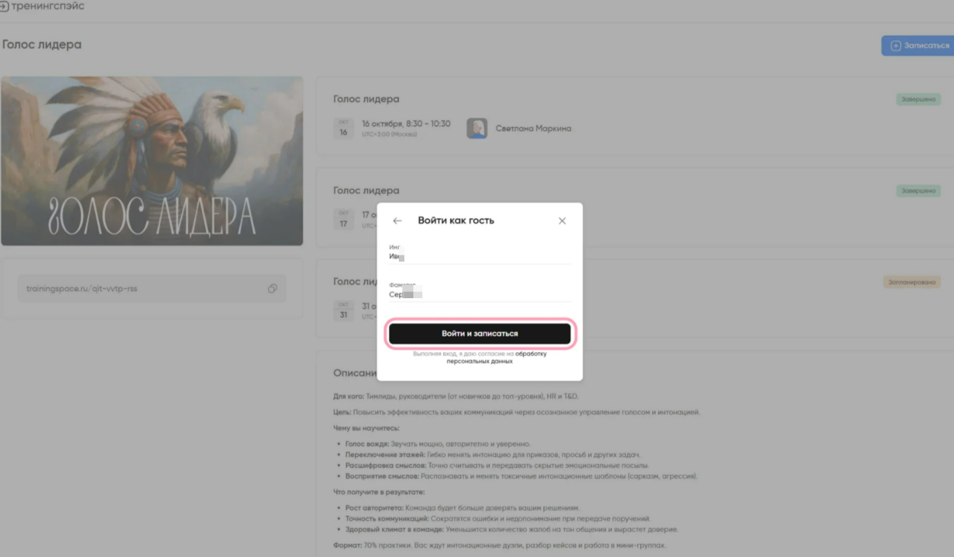 Выбрав гостевую запись, укажите ваши имя и фамилию. Нажмите «Войти и записаться», чтобы попасть на страничку мероприятия. Для подключения к мероприятию нажмите «Подключиться».