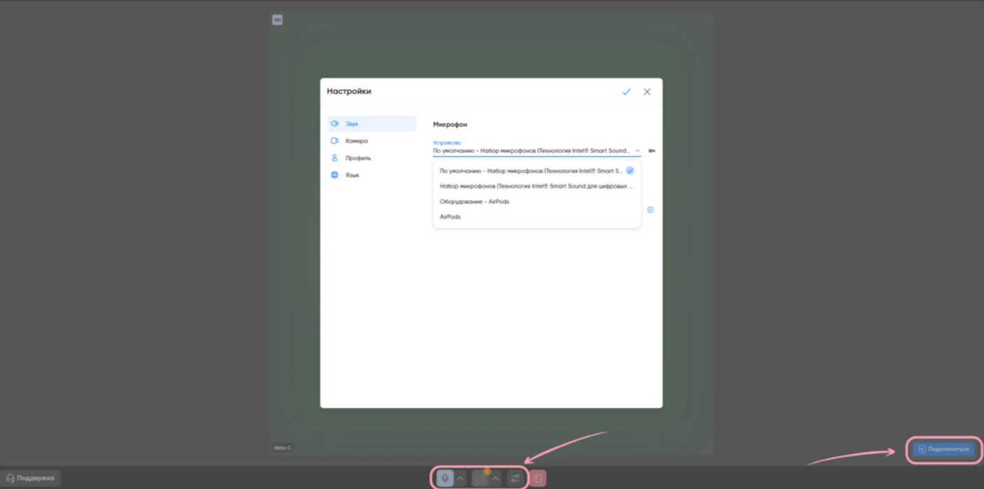 Если устройств несколько, выберите нужное: найдите значок настроек в нижней части страницы и укажите оборудование, которое хотите использовать. После этого нажмите «Подключиться», чтобы присоединиться к основной комнате с другими участниками.