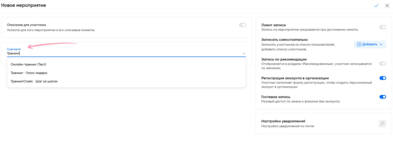 В открывшемся окне выберите сценарий мероприятия. Сделайте это в выпадающем списке, а если сценариев много, то пользуйтесь поиском по названию.