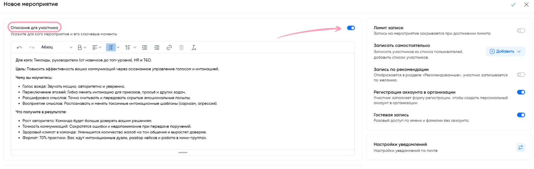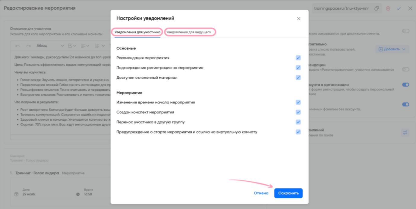 В разделе «Уведомления» вы можете настроить оповещения для участников и ведущих. Обратите внимание, что если был выбран курс вместо мероприятия, уведомление о мероприятии не будет отображаться.