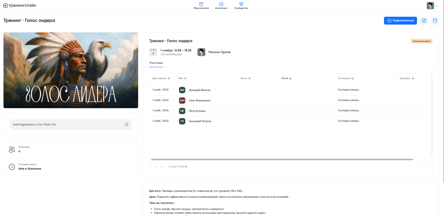 Каждому запланированному мероприятию создаётся страничка и присваивается ссылка (например, trainingspace.ru/xna-jopx-zfg). Как ведущий вы можете увидеть на этой странице: название мероприятия, дату проведения, ссылку на него, описание для участников и их количество, кнопку редактирования мероприятия и кнопку для подключения в правом верхнем углу.