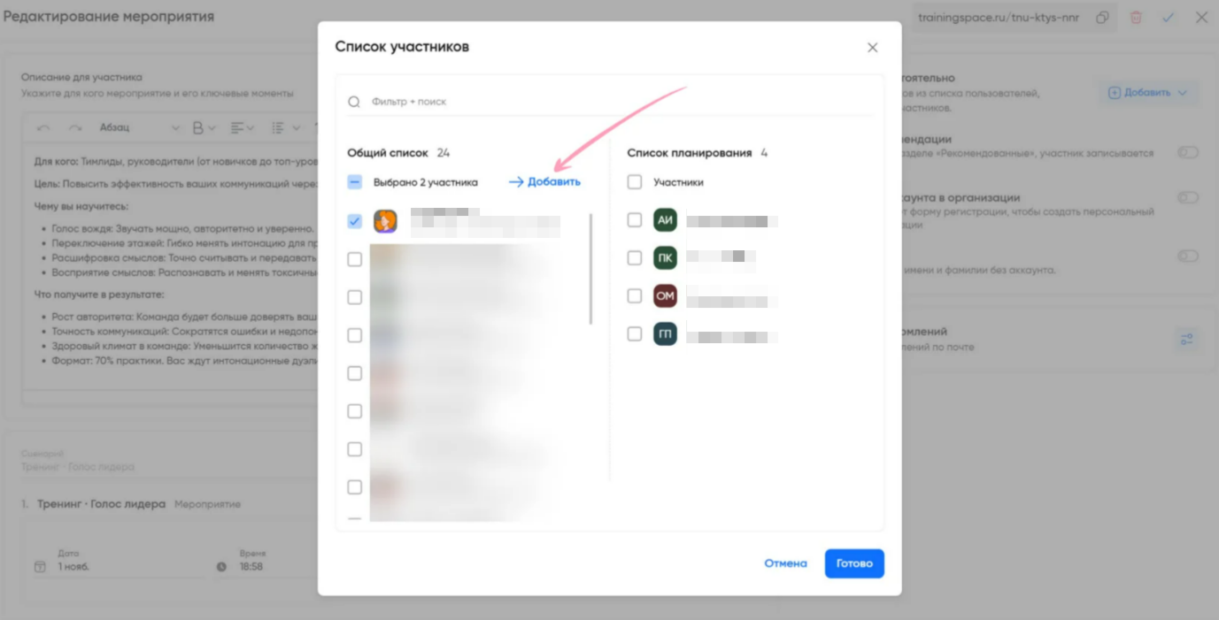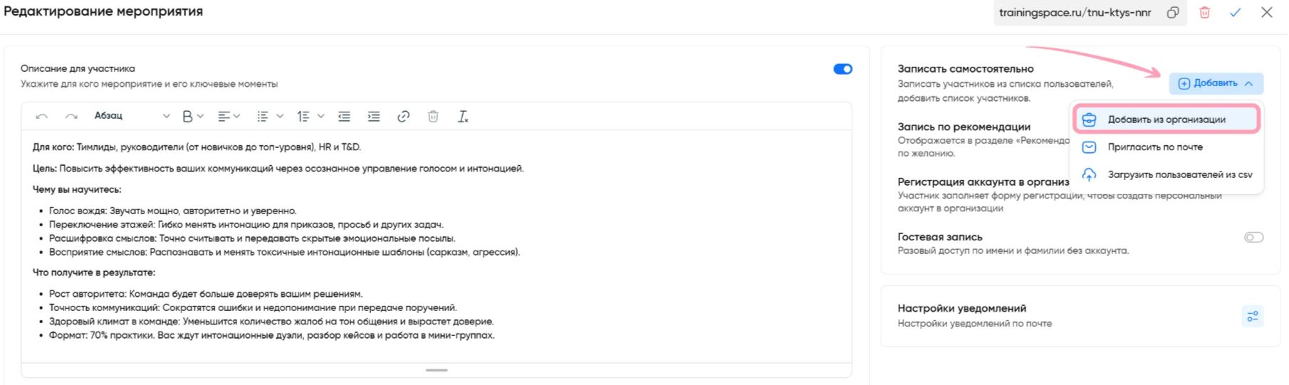 Если у участника есть активный аккаунт на платформе, вы можете сразу записать его на мероприятие. Для этого нажмите «Добавить», затем выберите «Добавить из организации» и укажите нужных участников.