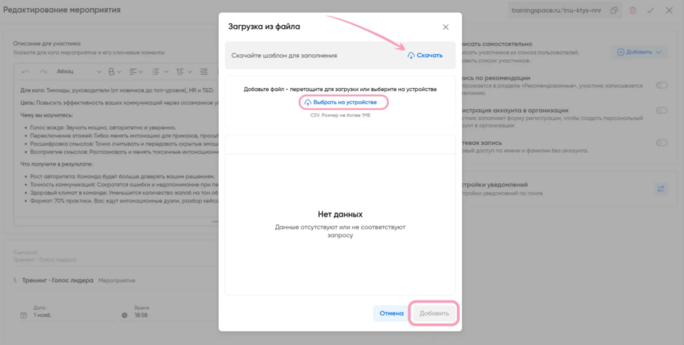 Вы можете загрузить участников через файл CSV. Для этого в разделе «Записать самостоятельно» нажмите «Добавить», затем «Загрузить пользователей из CSV». Скачайте шаблон для заполнения данных и после загрузки нажмите «Добавить».