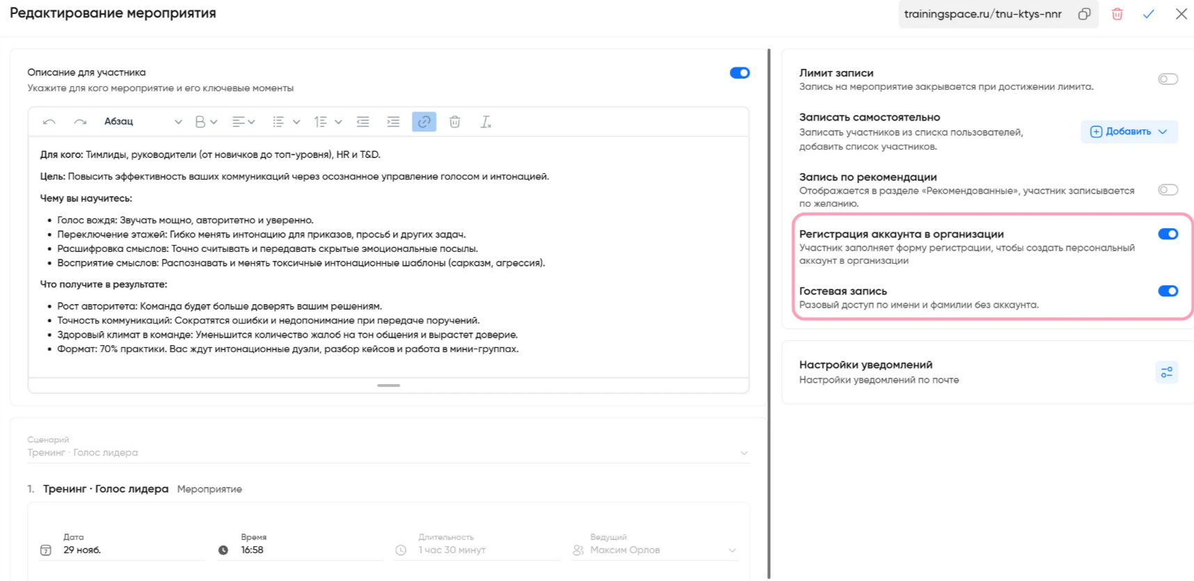 После выбора сценария вы можете добавить описание мероприятия для участников (включите тумблер, как на скриншоте), а также обязательно укажите дату, время проведения и выберите ведущего.