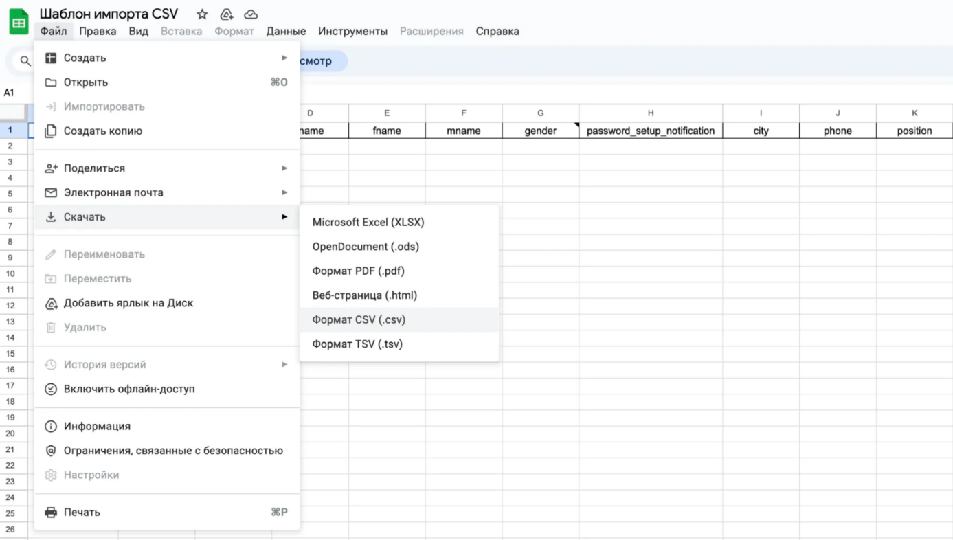 Заполните данные и скачайте файл в формате CSV.