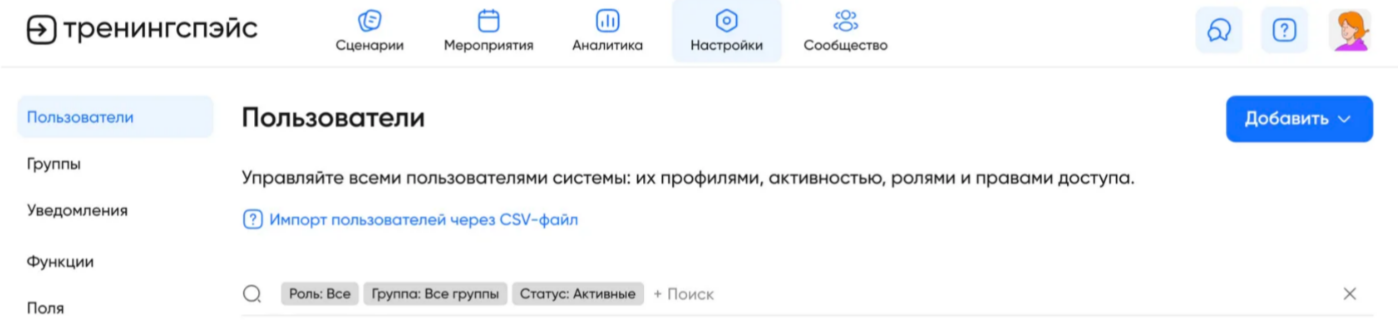 В разделе «Настройки» перейдите в подраздел «Пользователи». В правом верхнем углу нажмите кнопку «Добавить» и выберите опцию «Импорт».