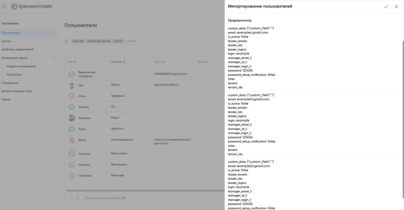 Загрузите подготовленный CSV-файл. Учтите, что сервис отобразит предварительный просмотр данных только для первых четырех пользователей.