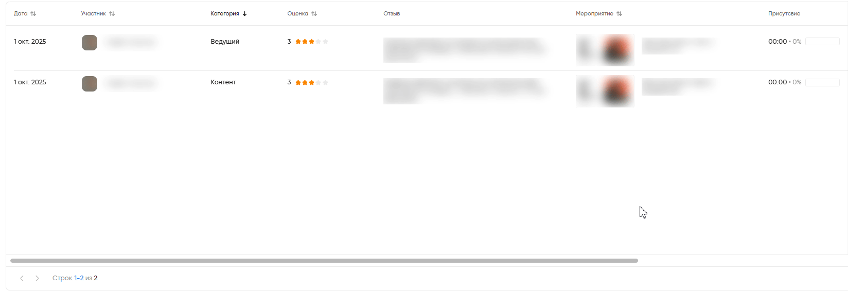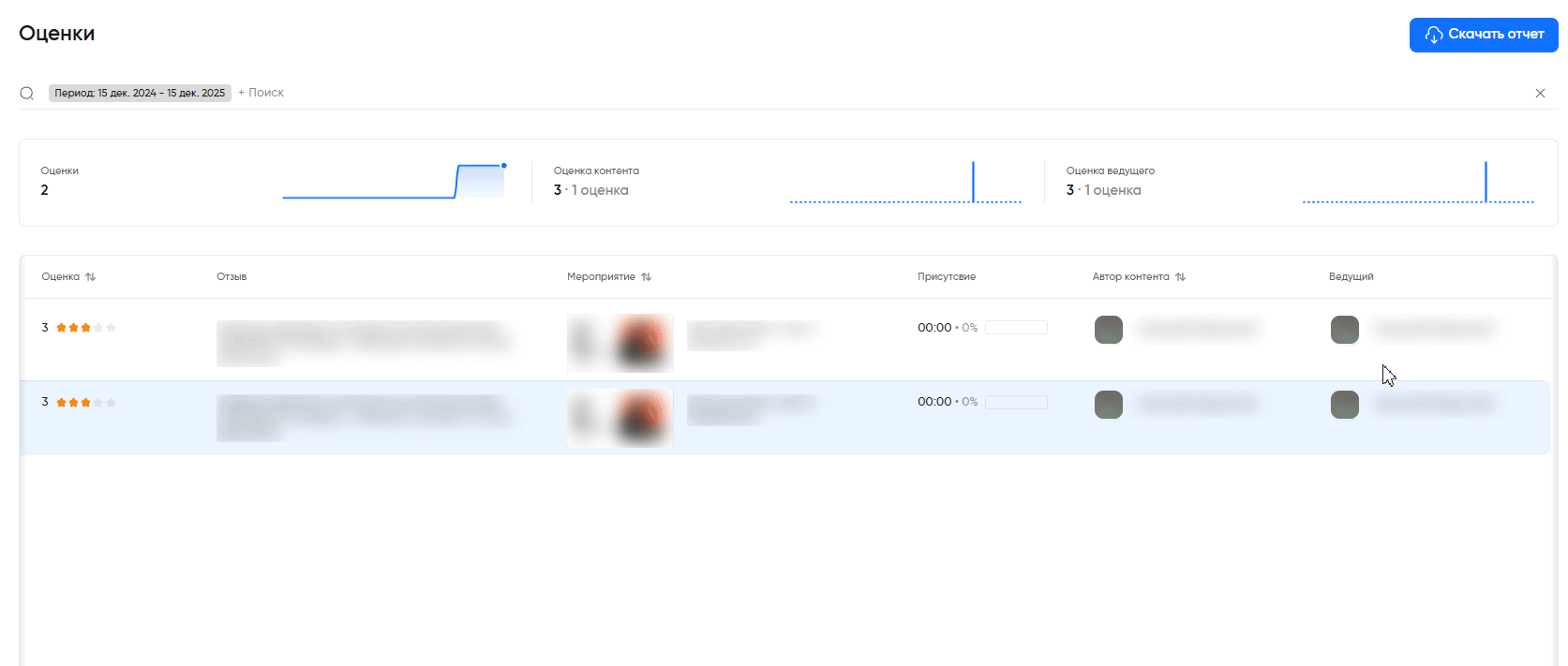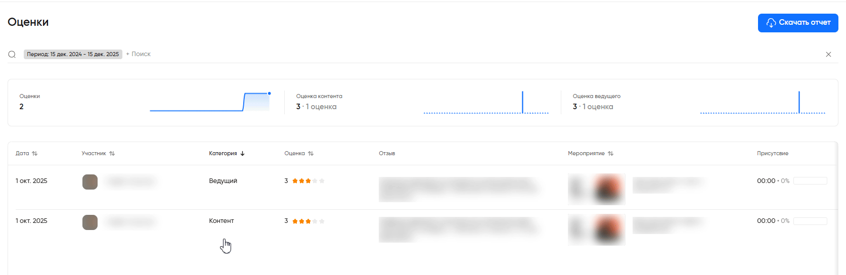 В разделе «Аналитика» → «Оценки» собираются оценки и отзывы о завершенных мероприятиях. Здесь вы сможете: