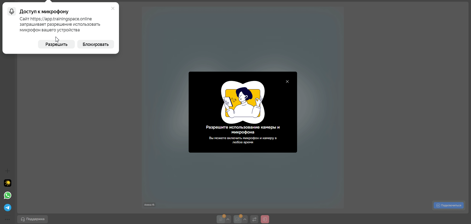 Эти кнопки управляют вашими устройствами. Нажмите на них, чтобы включить или выключить звука и видео.