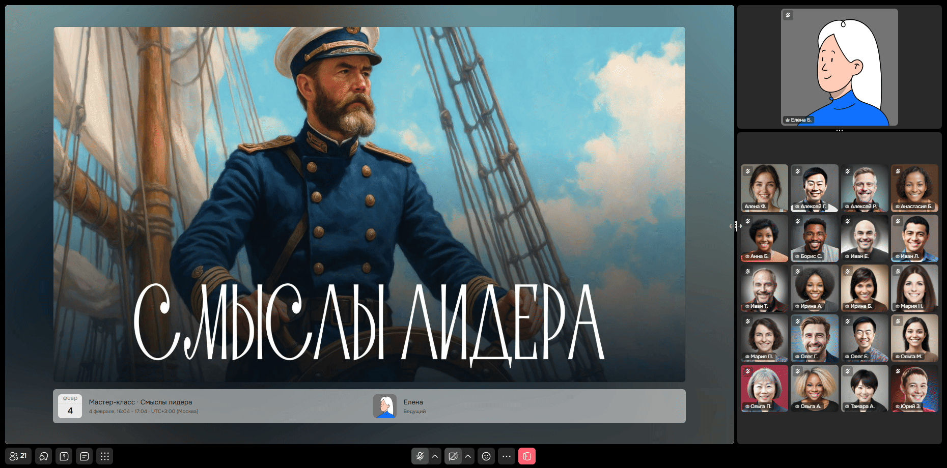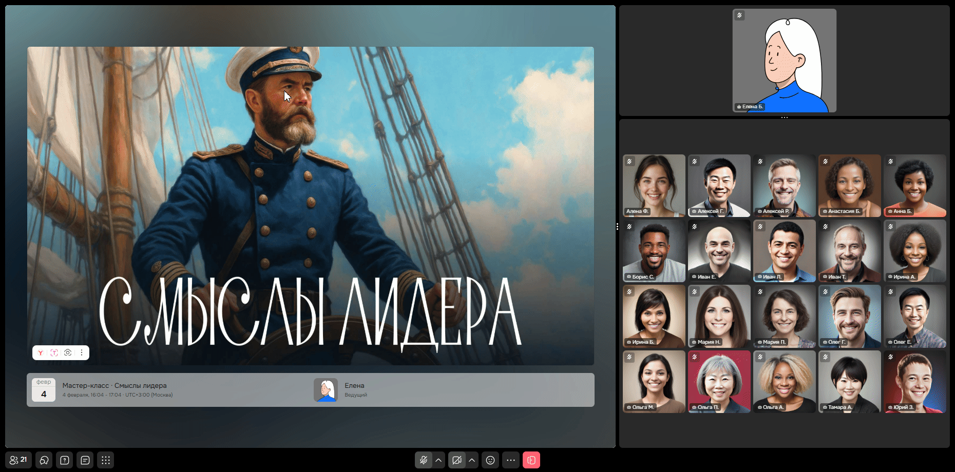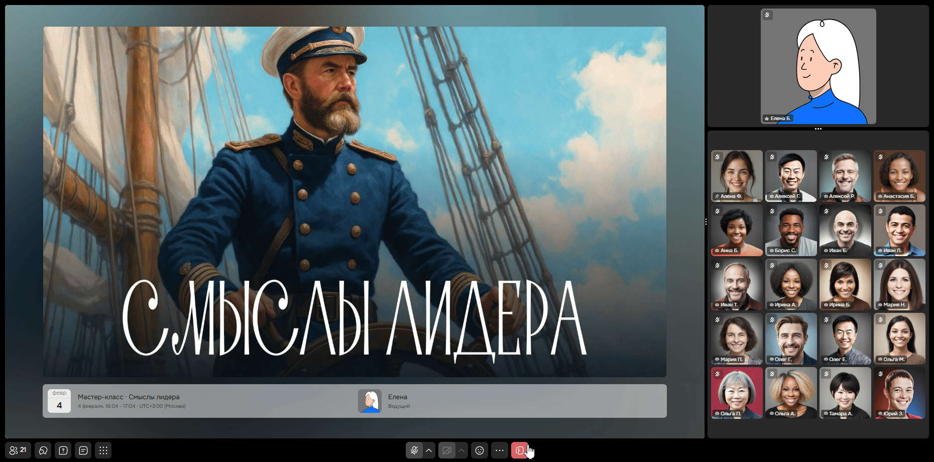 Окно с ведущим (там может быть видео или аватар ведущего).