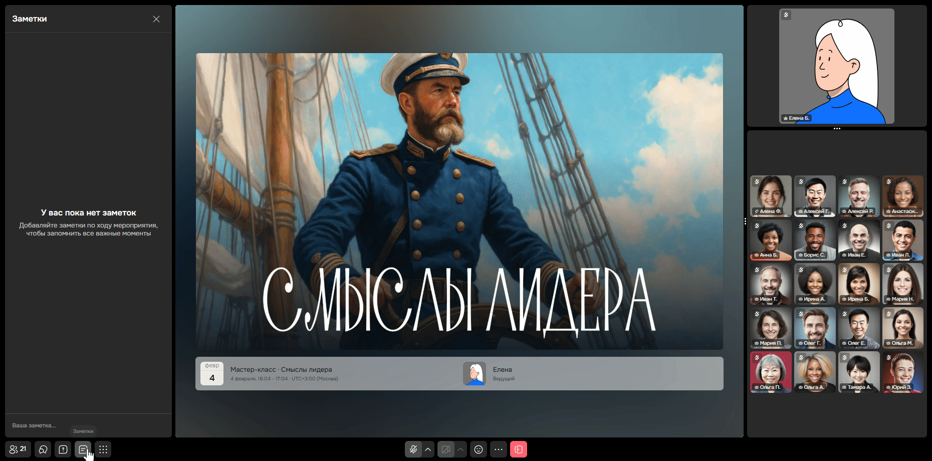 ✨ Подсказка: если вы зашли на мероприятие с телефона, то нажмите на три точки внизу экрана и выберите пункт «Заметки».