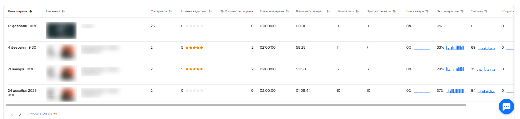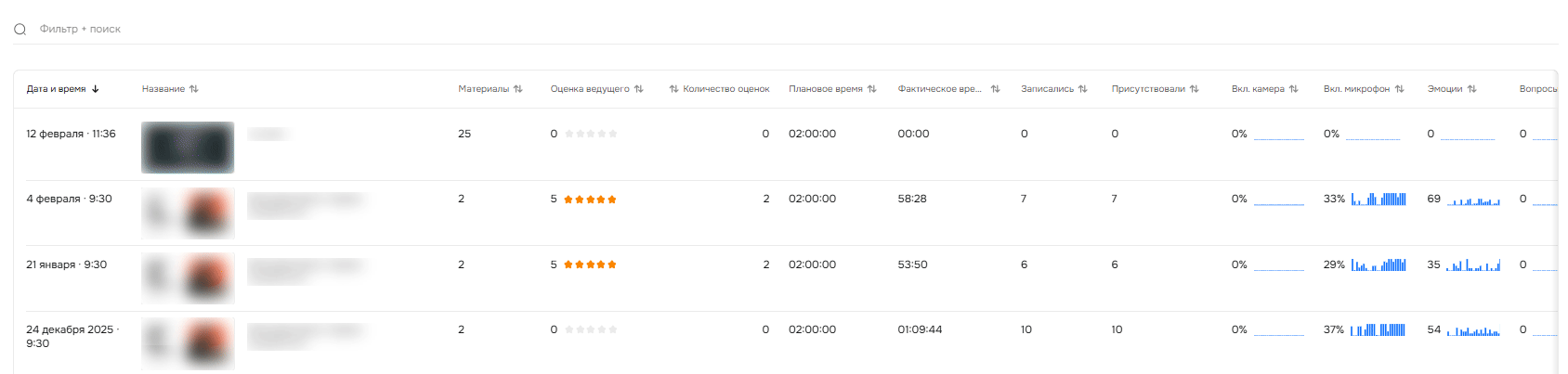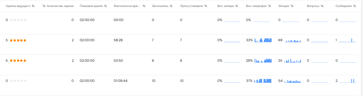 ⚠️ Важно: метрики «Вкл. камера (%)», «Вкл. микрофон (%)» и «Эмоции» начали учитываться в системе с 12 декабря 2025 года. Для мероприятий, проведенных ранее, эти данные отображаться не будут.