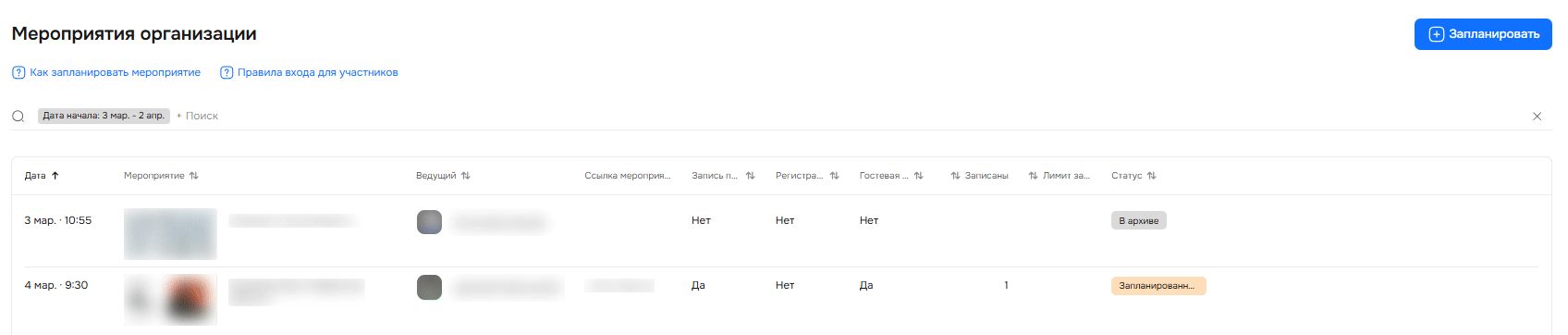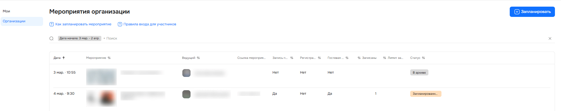 Во вкладке «Организации» видны все мероприятия, которые провела организация за все время. С помощью поиска и фильтров можно найти конкретное мероприятие и посмотреть его дату, название, ведущего, увидеть ссылку на само мероприятие, статус, сколько записано человек, лимит и т. п.