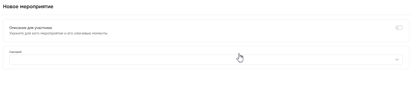В блоке «Сценарий» выберите сценарий из списка, по которому вы будете проводить мероприятие. После этого автоматически подтянутся блоки с датой, временем и ведущим, которые вы сможете настроить.