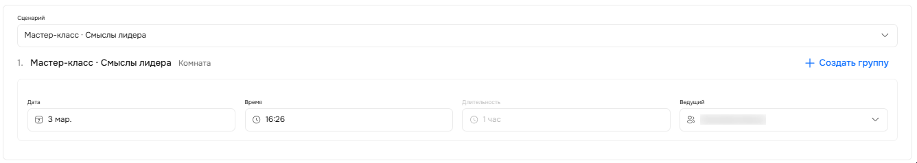 Если вам нужно, чтобы по конкретному сценарию прошло сразу несколько мероприятий, то вы можете создать дополнительную группу. Для этого нажмите на кнопку «Создать группу». В этом случае система добавит дополнительный блок с датой, временем и ведущим, и сверху появятся дополнительные поля, чтобы написать название групп.