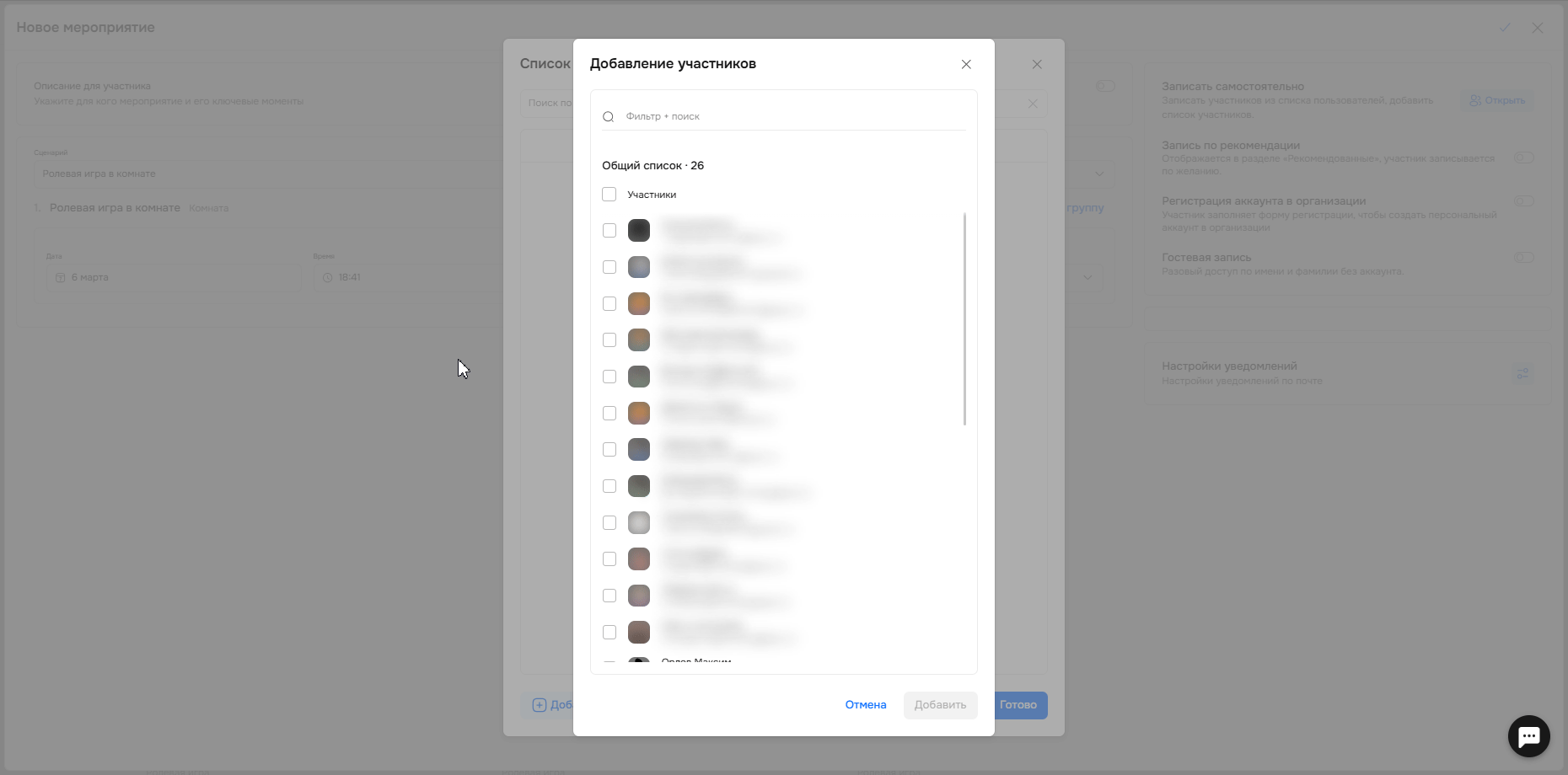 В блоке записи на мероприятие вы можете добавить участников, а также настроить все так, чтобы они могли сами зарегистрироваться.