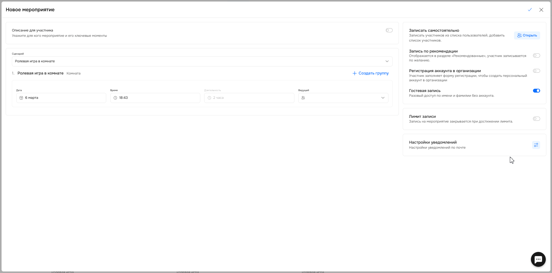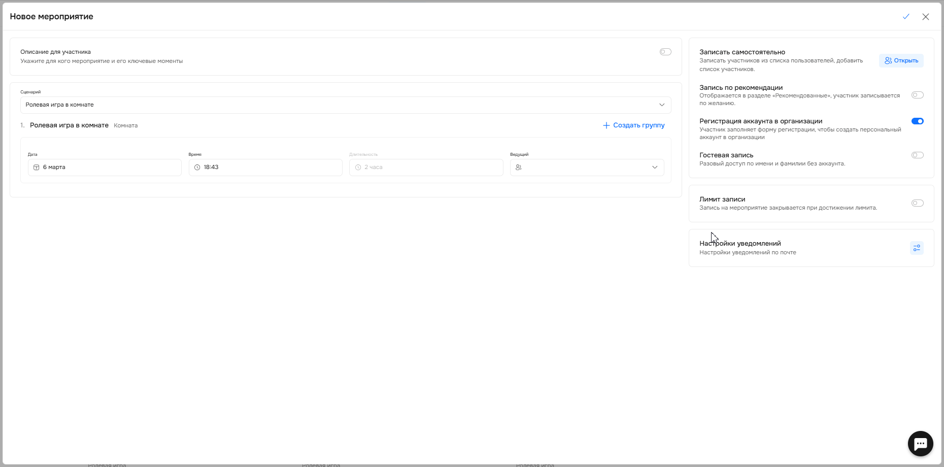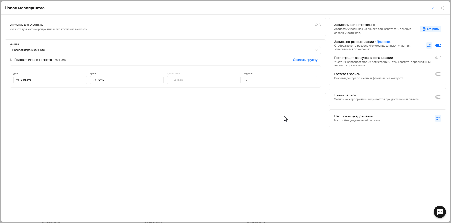 Также у вас есть возможность установить лимит по записи и настроить уведомления, которые получат участники и ведущие после создания мероприятия.