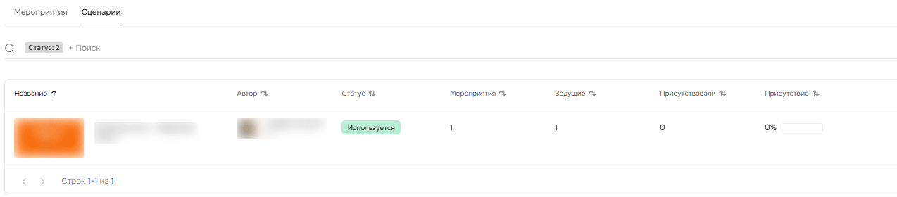 Чтобы найти конкретный сценарий, используйте поиск по названию, фильтры по статусу («Используется» / «Не используется») или по автору сценария.
